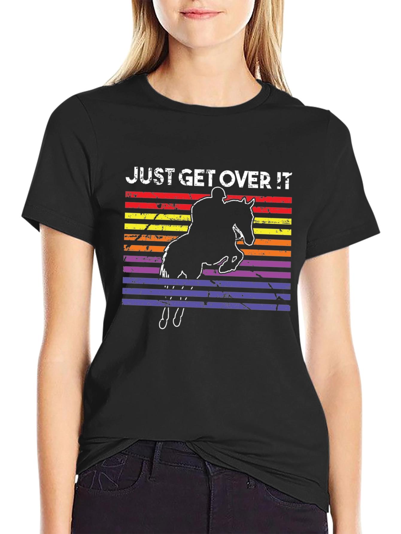 Luce esta original camiseta negra con un diseño ecuestre retro. Presenta la silueta de un jinete y su caballo saltando un obstáculo, sobre un fondo de rayas horizontales en colores vibrantes como rojo, naranja, amarillo y púrpura, dándole un toque vintage único. La frase "JUST GET OVER IT!" (¡SUPÉRALO!) añade un toque de motivación. Ideal para amantes de la equitación, esta camiseta es perfecta para vestir casualmente, entrenamientos o para expresar tu pasión por los caballos con estilo. Fabricada en un tejido suave y cómodo, esta prenda te asegura confort y durabilidad. ¡Añade un toque audaz y deportivo a tu armario!