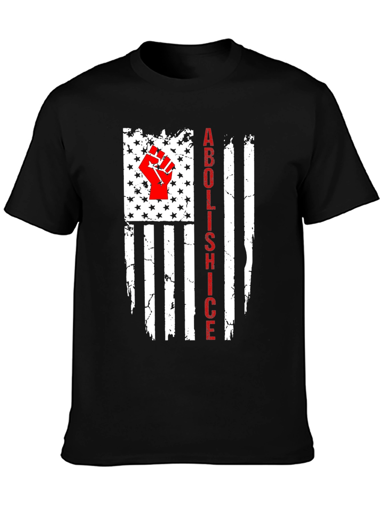 Luce esta camiseta negra de diseño audaz que presenta una reinterpretación de la bandera estadounidense con un mensaje potente. El diseño incluye un puño rojo alzado sobre un campo de estrellas blancas, franjas blancas grunge y la inscripción vertical 'ABOLISH ICE' en rojo intenso. Confeccionada en un material que parece ser suave y cómodo, esta camiseta es ideal para expresar tus convicciones políticas con estilo. Perfecta para manifestaciones, eventos sociales o para llevar a diario si quieres mostrar tu postura. Un diseño llamativo que seguro atraerá miradas y generará conversación.