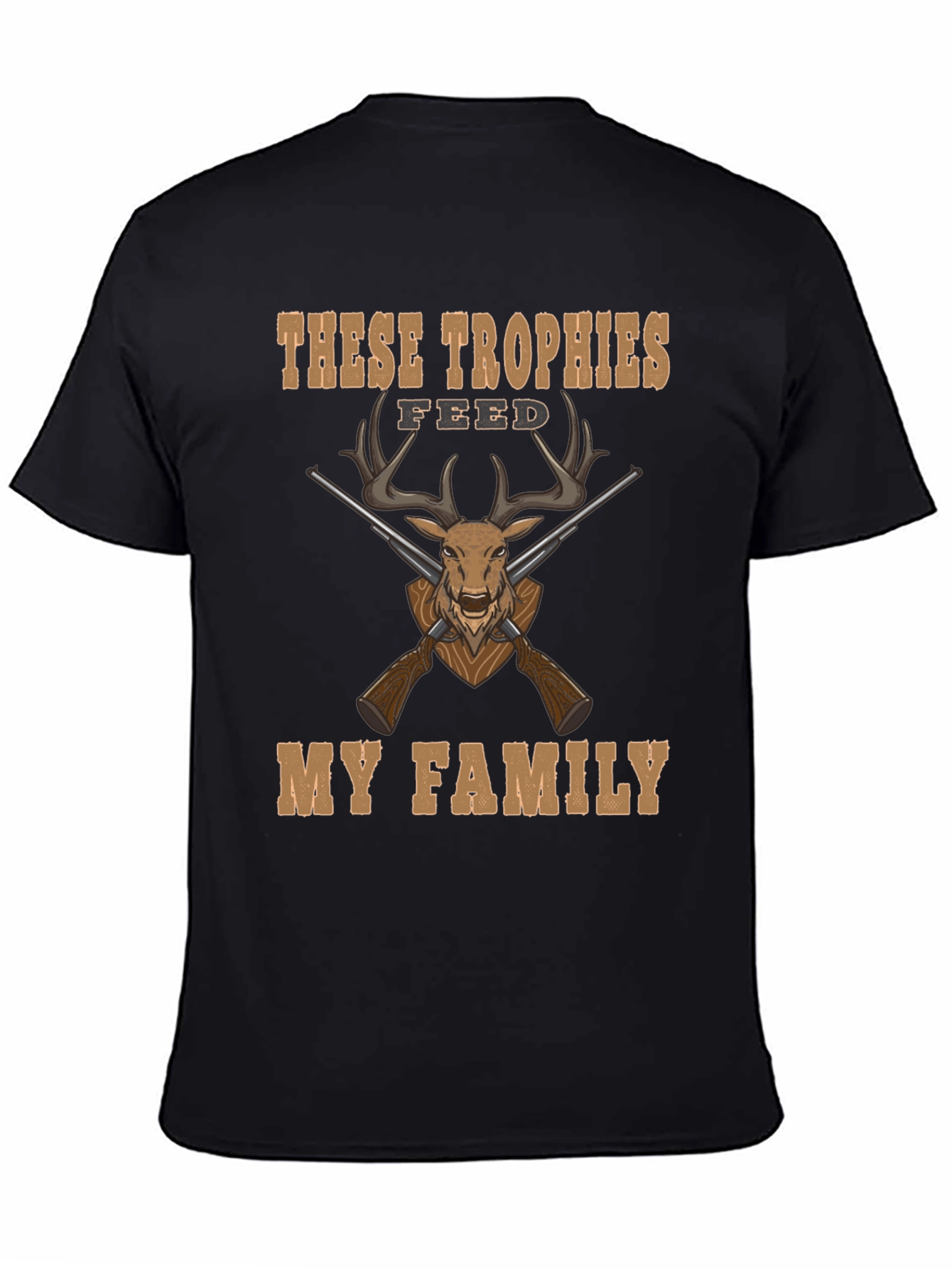 Muestra tu pasión por la caza con esta camiseta negra. Presenta un diseño llamativo con la frase "Estos trofeos alimentan a mi familia" en letras color café. El estampado central muestra la cabeza de un venado con un par de rifles cruzados, creando un gráfico audaz. Fabricada en tela suave y cómoda, es perfecta para usar en el campo, en una salida casual o para cualquier amante de la naturaleza. Un excelente regalo para cazadores y entusiastas de la vida al aire libre que desean expresar su estilo y valores. ¡Añade esta camiseta única a tu colección!