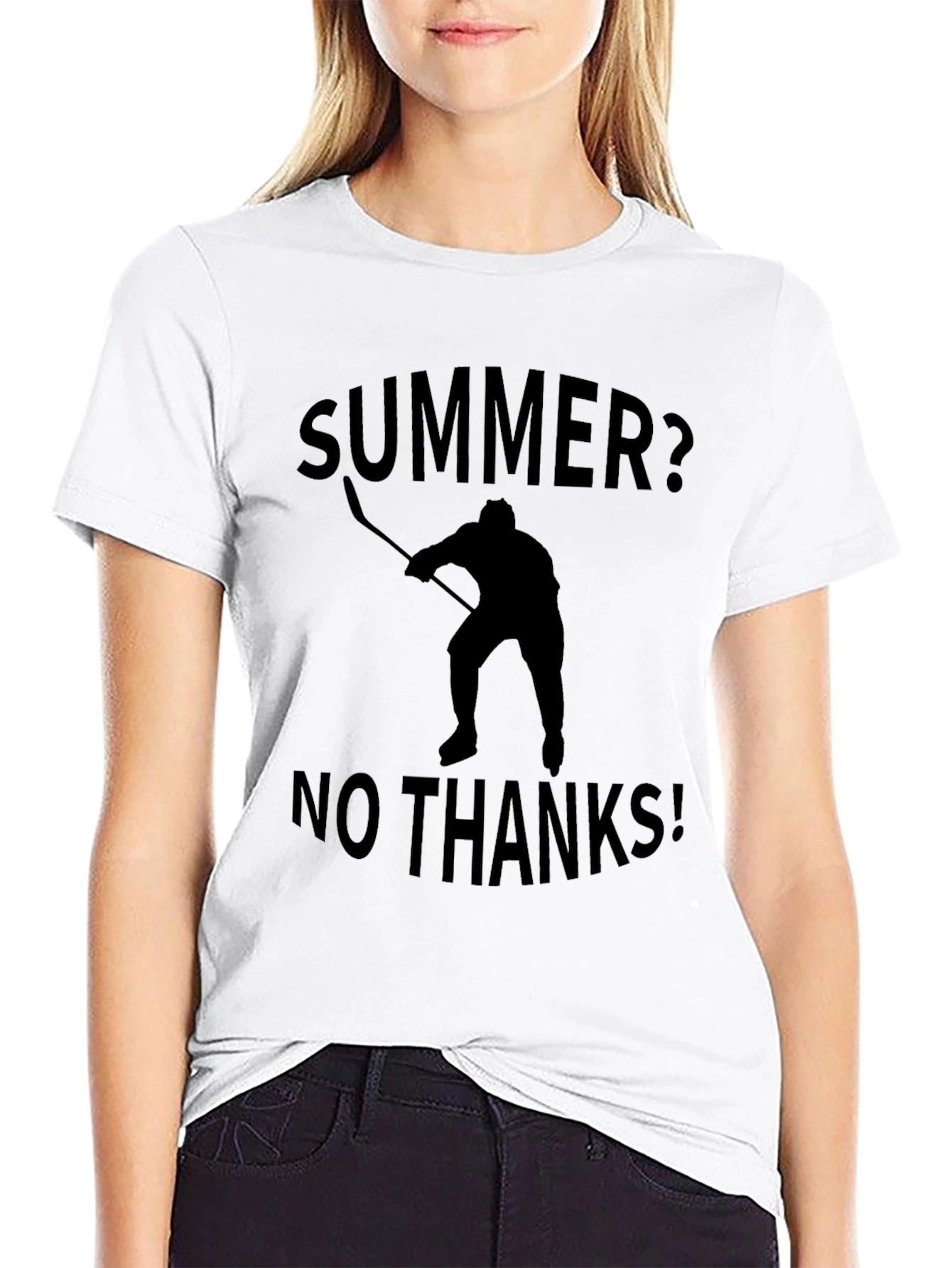 Luce tu pasión por el hockey con esta camiseta negra de manga corta. Presenta un diseño gráfico llamativo con el texto "¿Verano? ¡No Gracias!" y la silueta de un jugador de hockey. Perfecta para los amantes del deporte que prefieren el hielo al sol. Fabricada con materiales cómodos y duraderos, ideal para usar en el día a día, partidos o entrenamientos. Muestra tu espíritu deportivo con estilo y declara tu amor por el hockey en cualquier temporada. Una prenda imprescindible para cualquier aficionado.