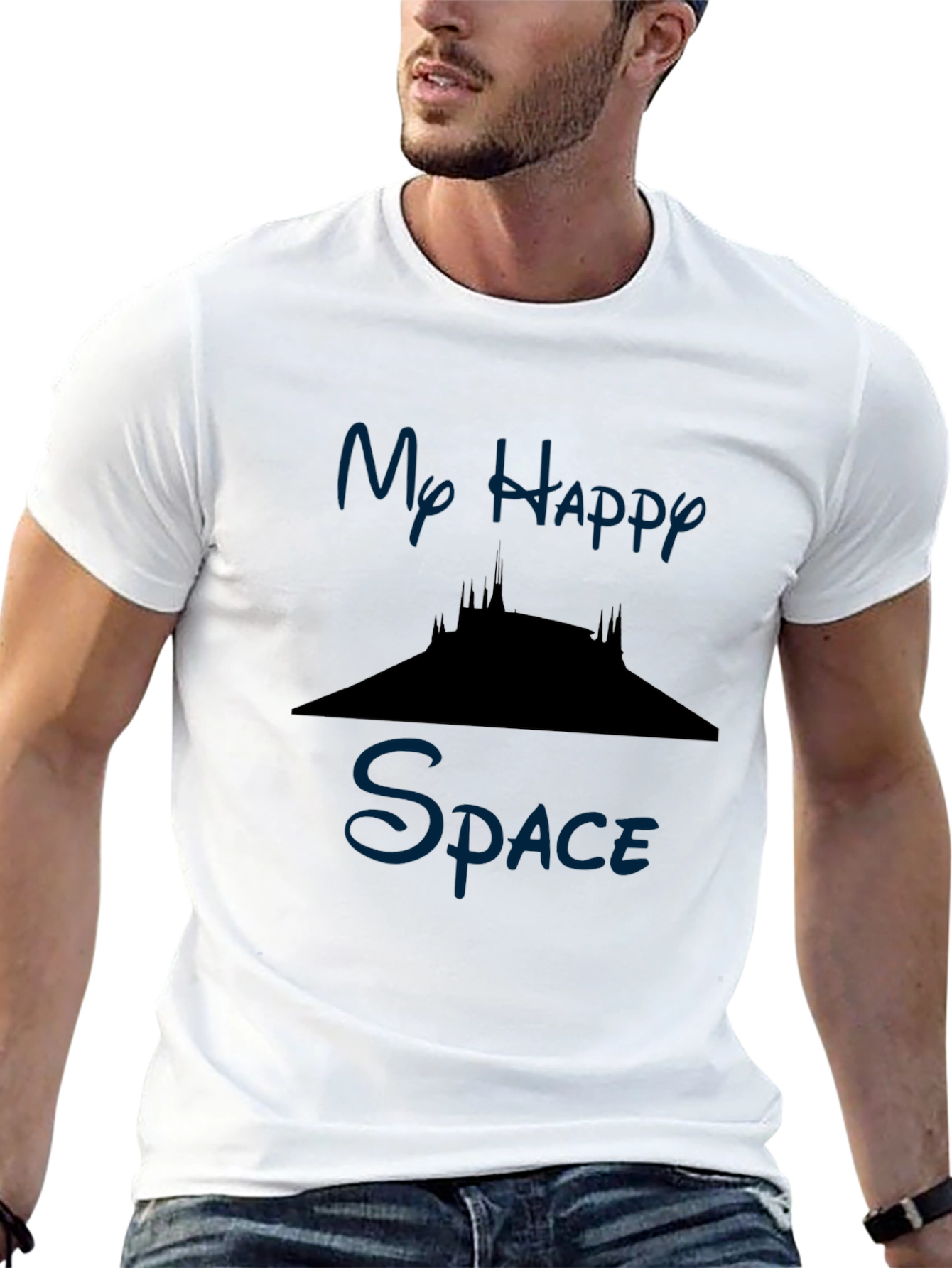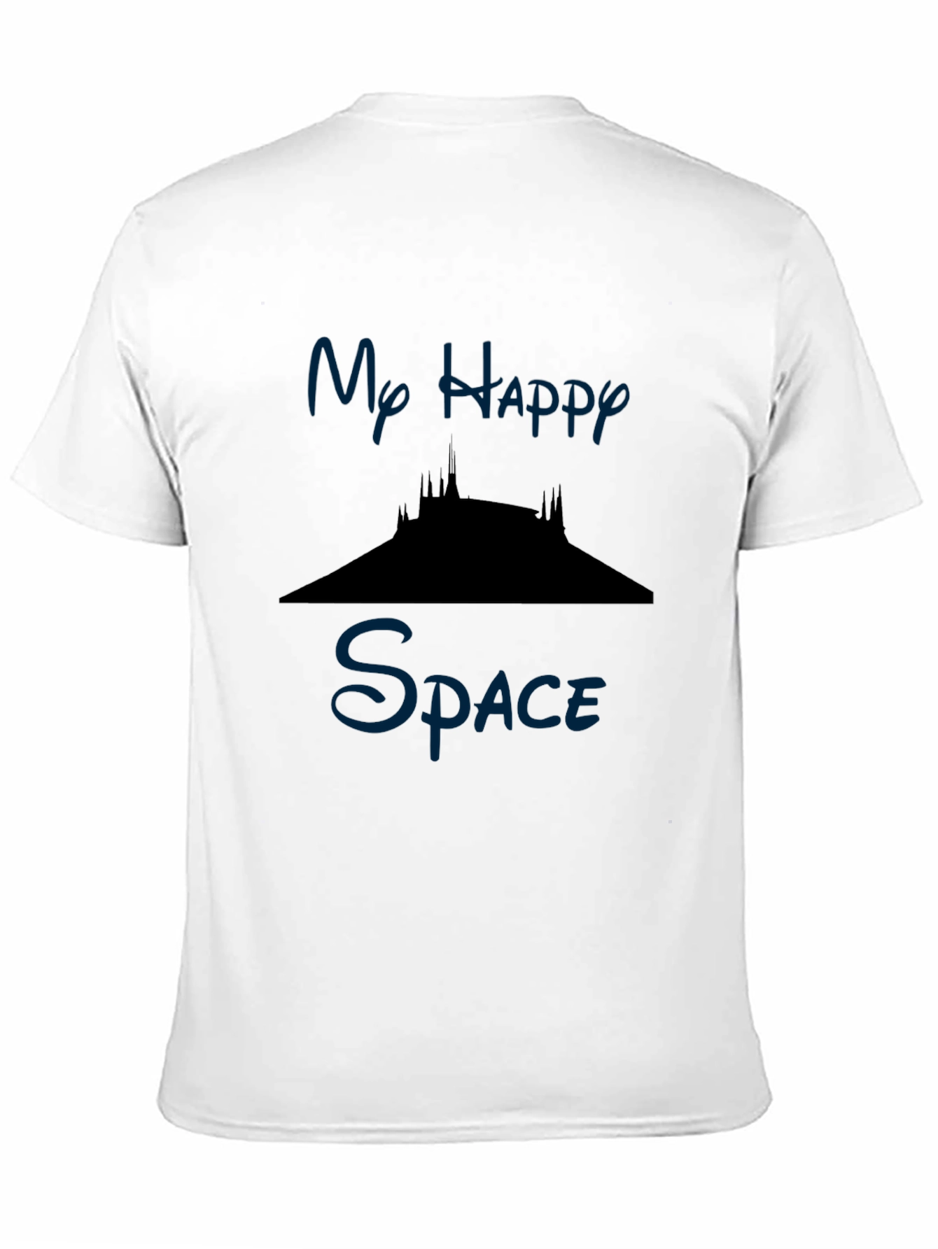 Muestra tu amor por la magia con esta elegante camiseta negra para hombre. Presenta un diseño inspirado en un icónico parque temático, con la frase 'Mi Espacio Feliz' estampada en un llamativo color azul. La silueta de la montaña rusa espacial agrega un toque divertido y reconocible. Fabricada en un material suave y cómodo, esta camiseta de manga corta es perfecta para usar en un día casual, en el parque o en cualquier lugar donde quieras expresar tu espíritu aventurero. Un básico imprescindible para cualquier fanático.