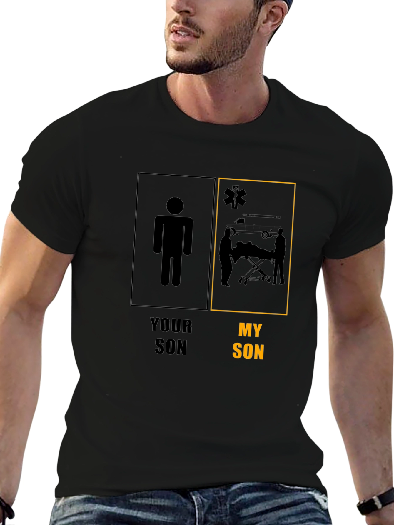¡Muestra orgullo por tu hijo con esta camiseta única! De color negro, presenta un diseño gráfico que compara "tu hijo" con "mi hijo". El lado de "mi hijo" muestra una ilustración de paramédicos atendiendo a un paciente, simbolizando heroísmo y servicio. Ideal para padres orgullosos de hijos que trabajan en el campo de la medicina de emergencia. Fabricada con materiales cómodos y duraderos, esta camiseta es perfecta para uso diario o para regalar. ¡Luce tu apoyo y comparte la admiración por el valiente trabajo de tu hijo paramédico!