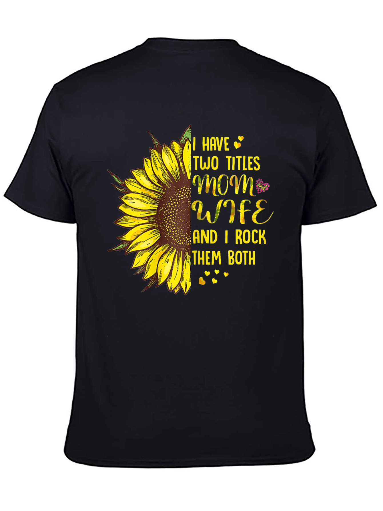 ¡Celebra tus múltiples roles con estilo! Esta camiseta negra de corte clásico presenta un diseño vibrante de girasol junto a la frase "I Have Two Titles Mom Wife And I Rock Them Both". Ideal para la mamá y esposa moderna que se enorgullece de su rol. Perfecta para un look casual y cómodo en el día a día o para regalar a esa persona especial. Su tejido suave garantiza confort durante todo el día. ¡Muestra al mundo tu poder femenino con esta camiseta única!