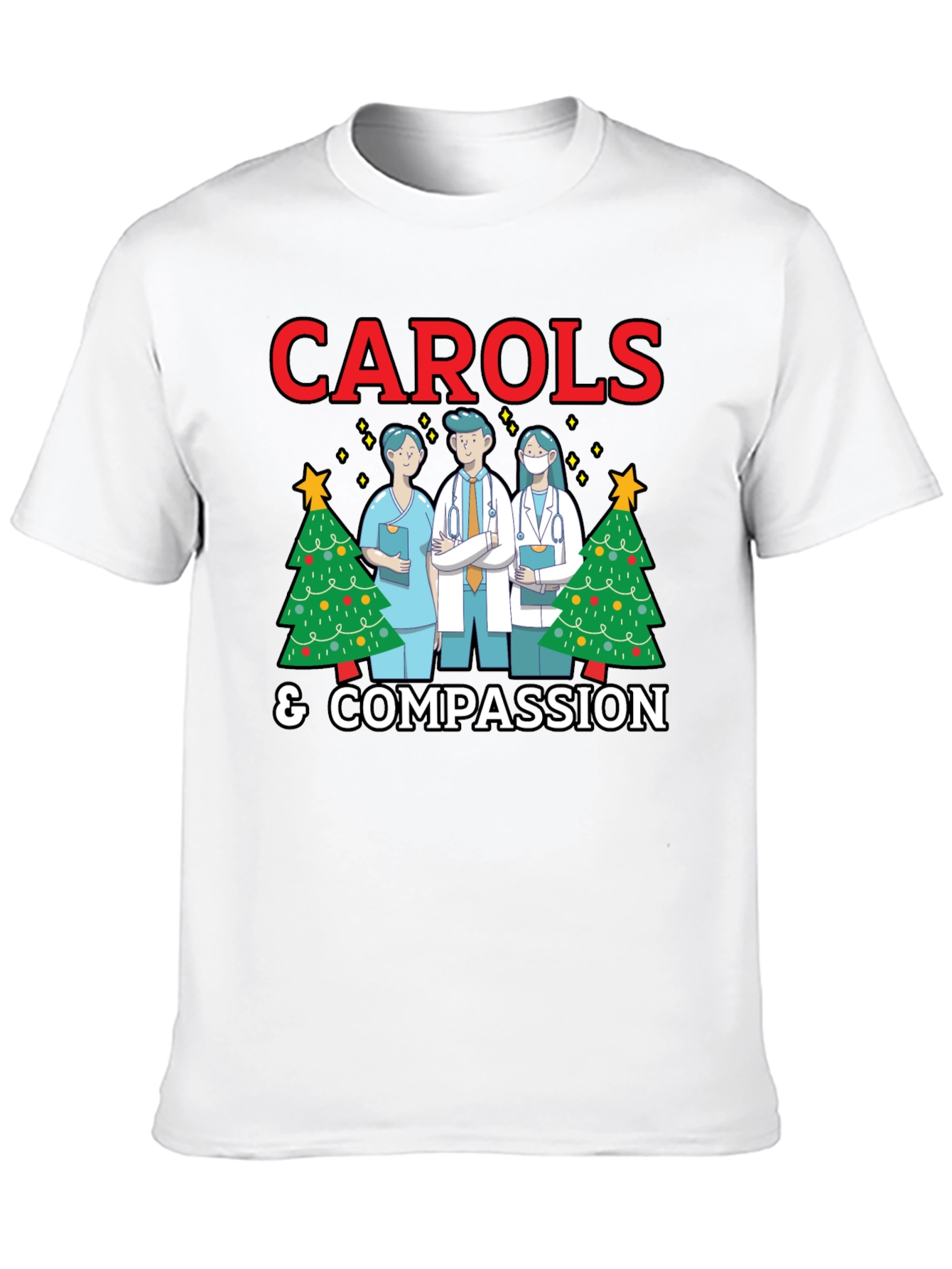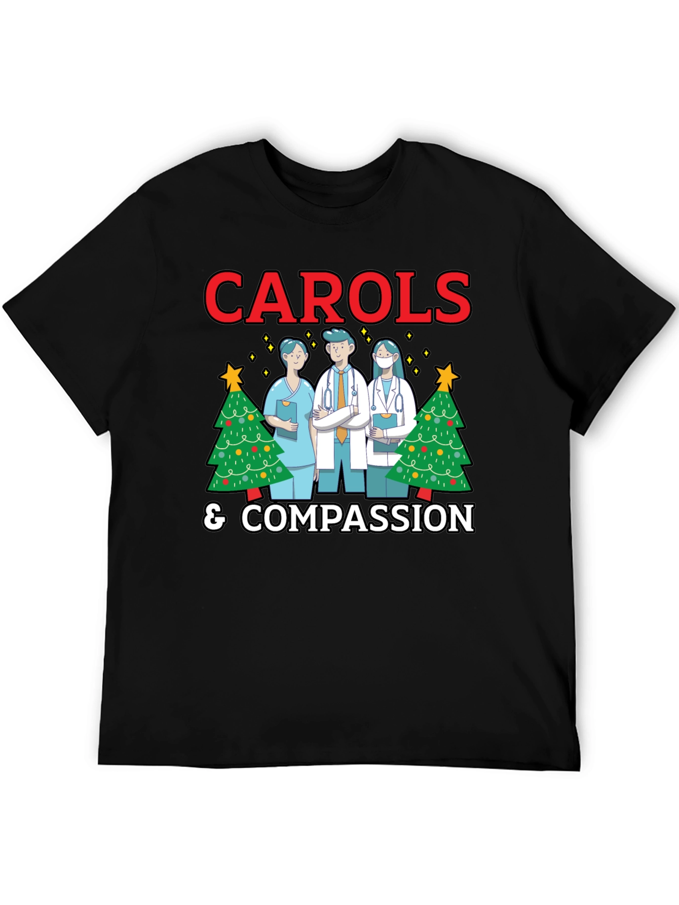Celebra la temporada navideña con esta original camiseta negra que destaca la labor de los profesionales de la salud. Presenta un diseño festivo con la frase 'CAROLS & COMPASSION' en letras rojas llamativas, acompañada de ilustraciones de médicos y enfermeras con árboles de Navidad decorados. Ideal para llevar al trabajo, a eventos navideños o simplemente para mostrar tu apoyo a los héroes de la salud durante estas fechas especiales. Perfecta para regalar a médicos, enfermeras o cualquier persona relacionada con el sector sanitario. Fabricada con materiales cómodos y duraderos.