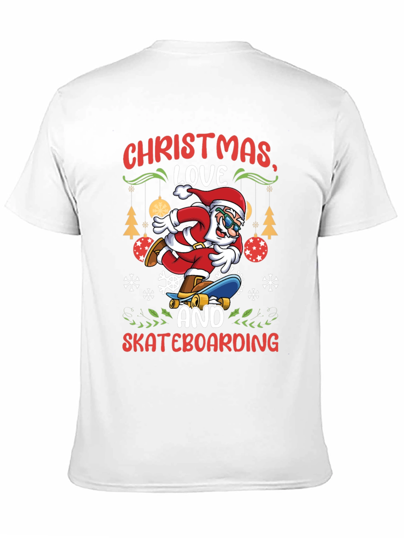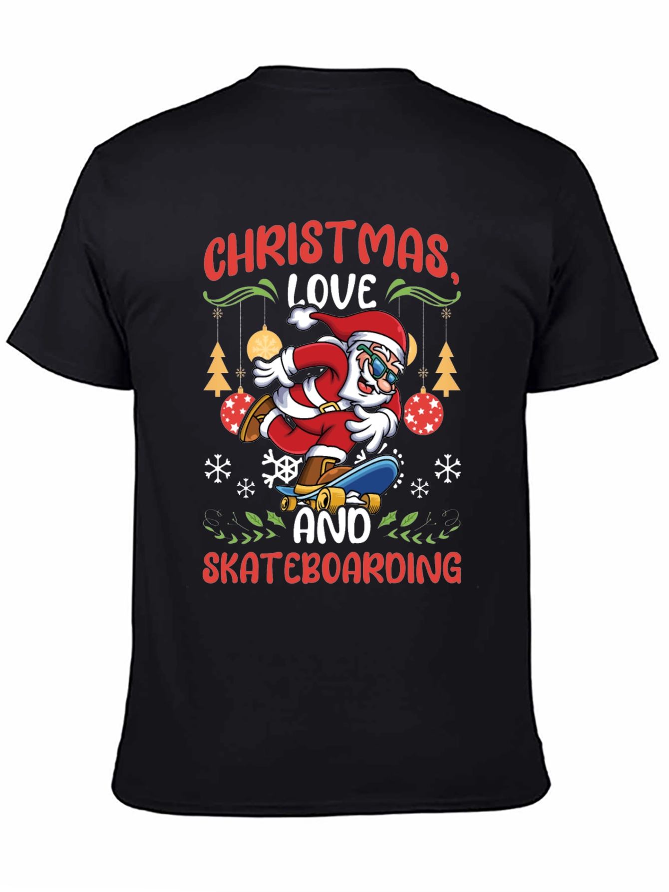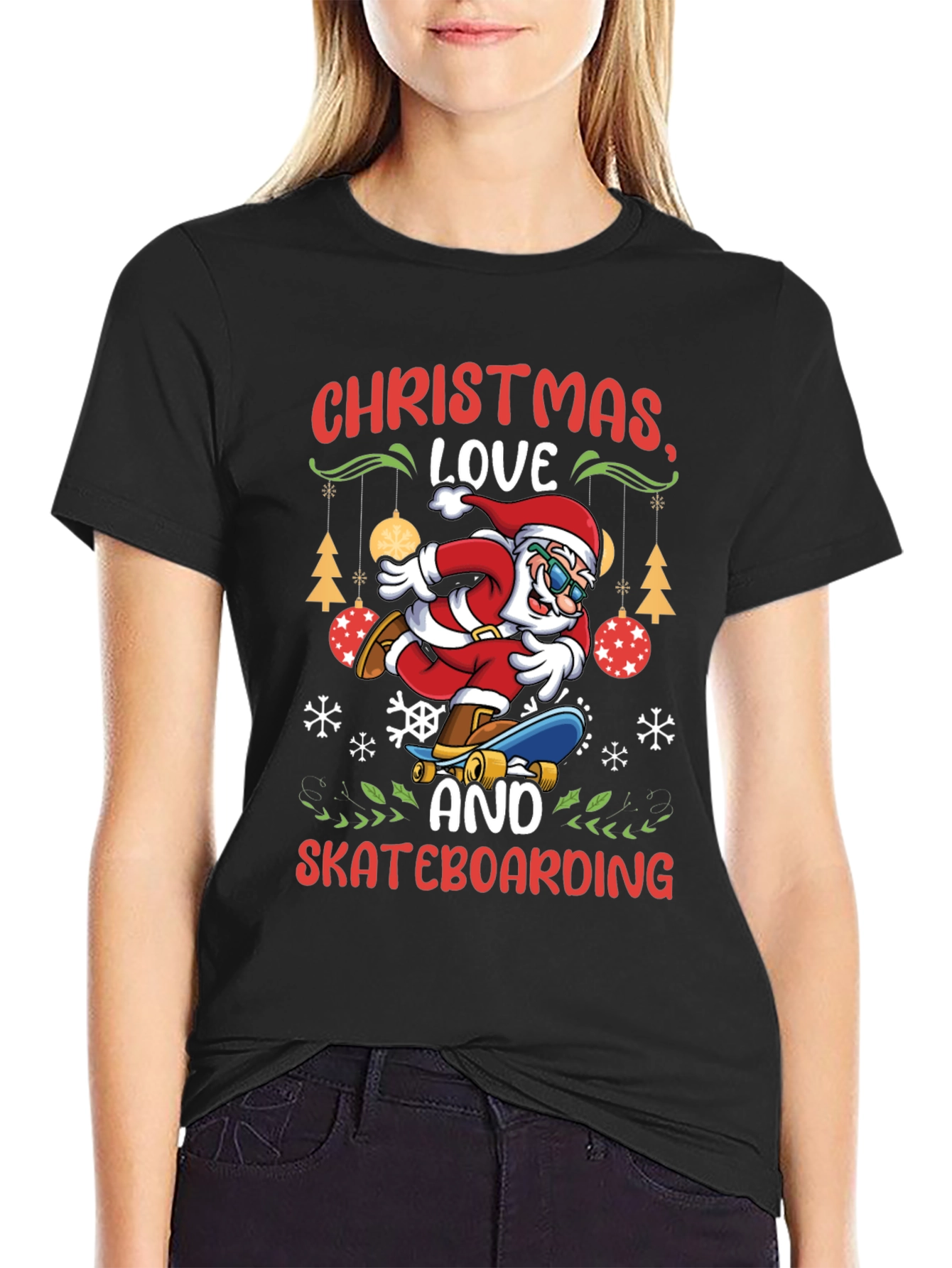 ¡Prepárate para las fiestas con estilo! Esta camiseta negra de manga corta presenta un diseño festivo y divertido de Santa Claus patinando. Ideal para los amantes del skateboarding y el espíritu navideño. El diseño incluye la frase "Christmas, Love and Skateboarding", adornos navideños y copos de nieve, todo con colores brillantes y llamativos. Confeccionada con materiales de alta calidad, esta camiseta es cómoda y duradera, perfecta para usar durante las celebraciones navideñas o para darle un toque festivo a tu look diario. Una excelente opción para regalar a tus amigos y familiares que aman el skateboarding y la Navidad. ¡Destaca con esta prenda única y original!