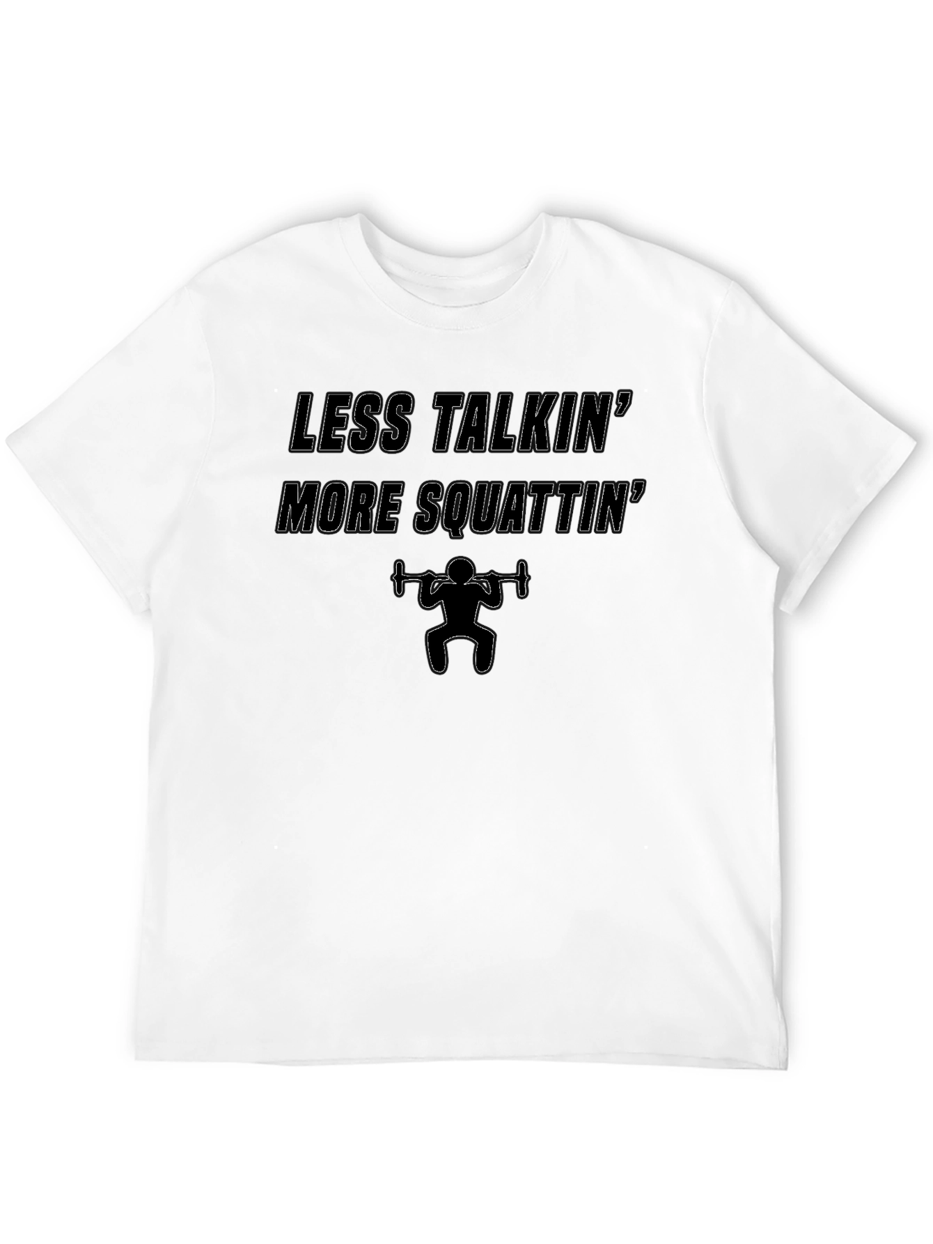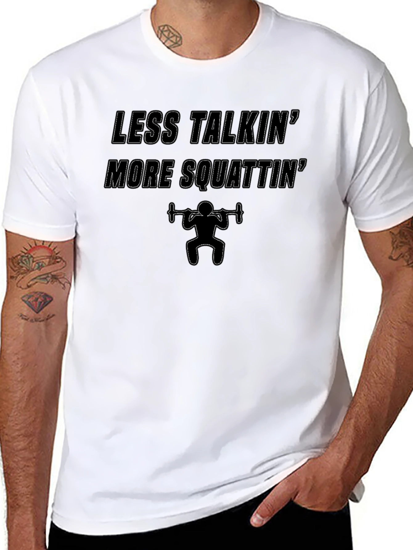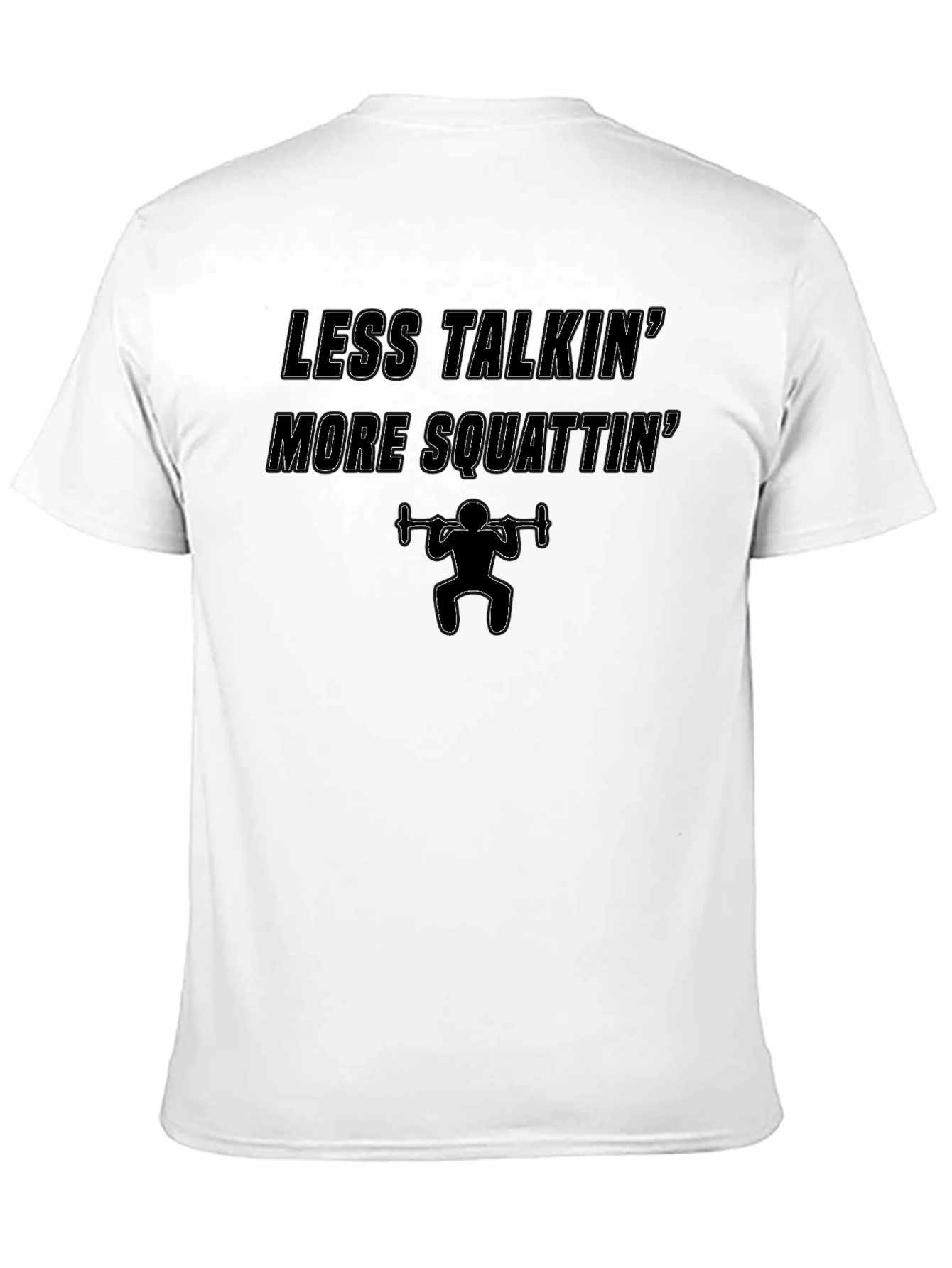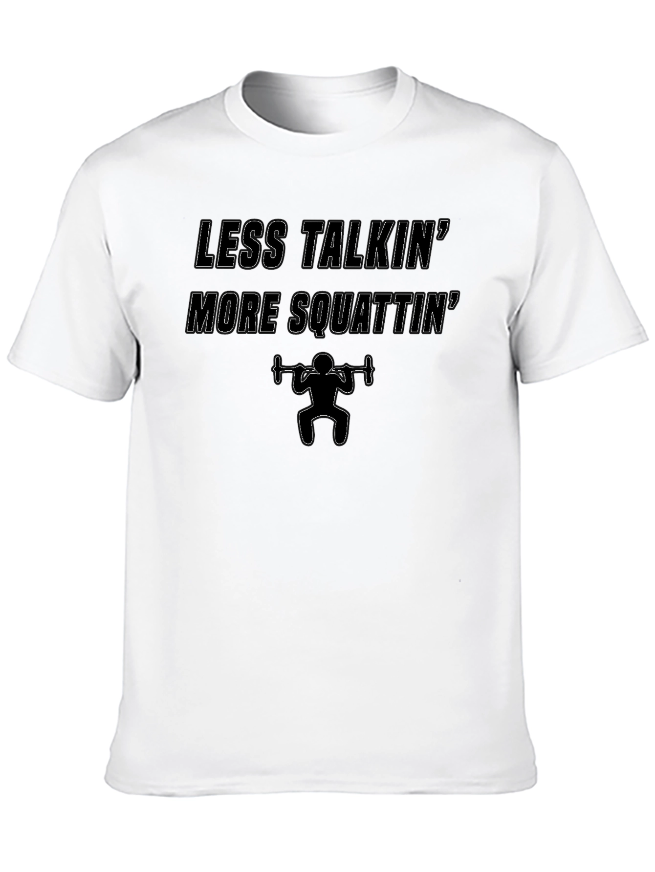 Luce esta camiseta negra con un diseño motivacional perfecto para tus entrenamientos. El estampado "LESS TALKIN' MORE SQUATTIN'" y la silueta de un levantador de pesas te inspirarán a dar lo mejor de ti en cada sentadilla. Su corte clásico y tejido suave te brindan comodidad y libertad de movimiento. Ideal para usar en el gimnasio, en casa o para un look casual con un toque deportivo. Fabricada con materiales duraderos y de alta calidad, esta camiseta se convertirá en tu prenda favorita para demostrar tu pasión por el fitness. ¡Consigue la tuya y levanta más que excusas!