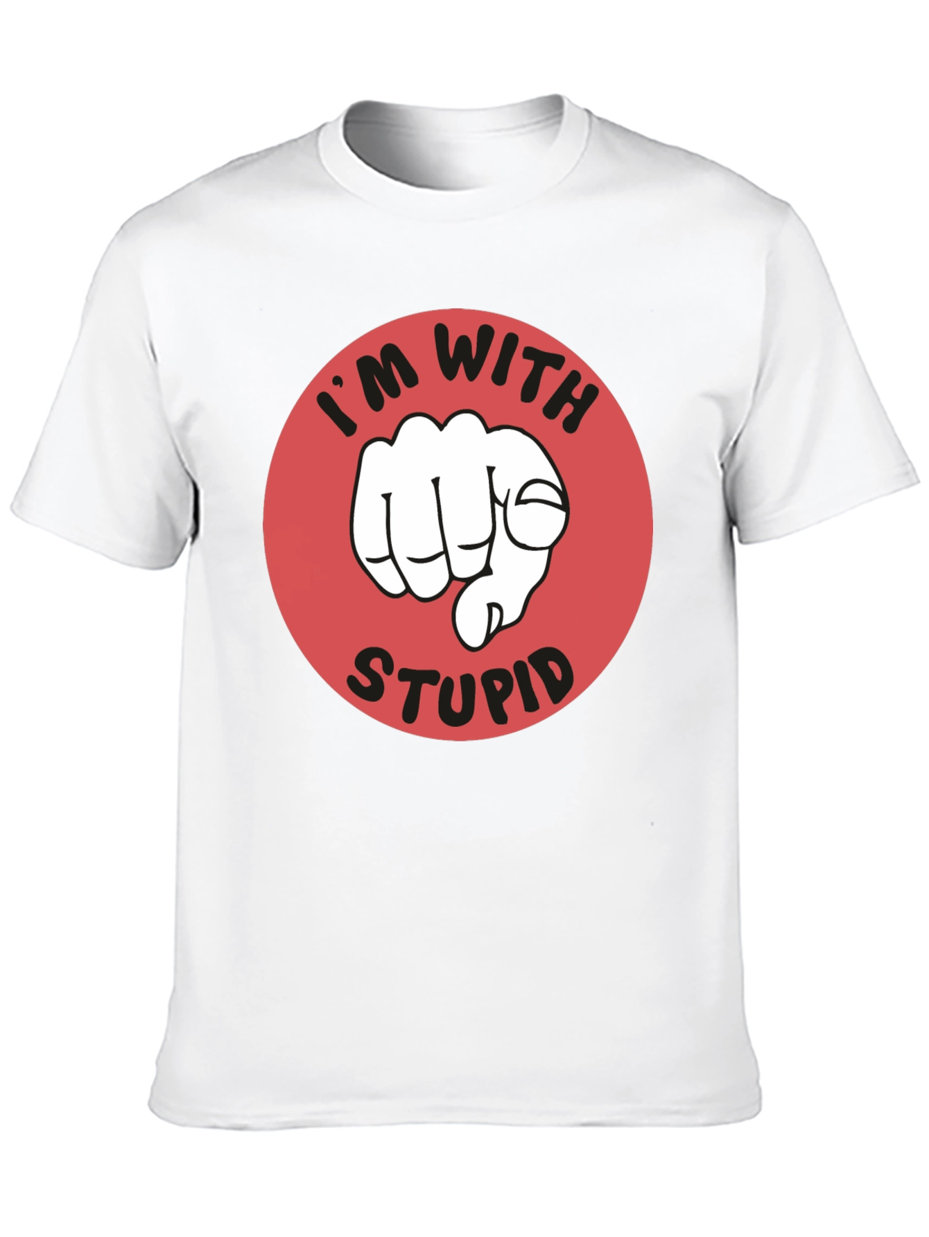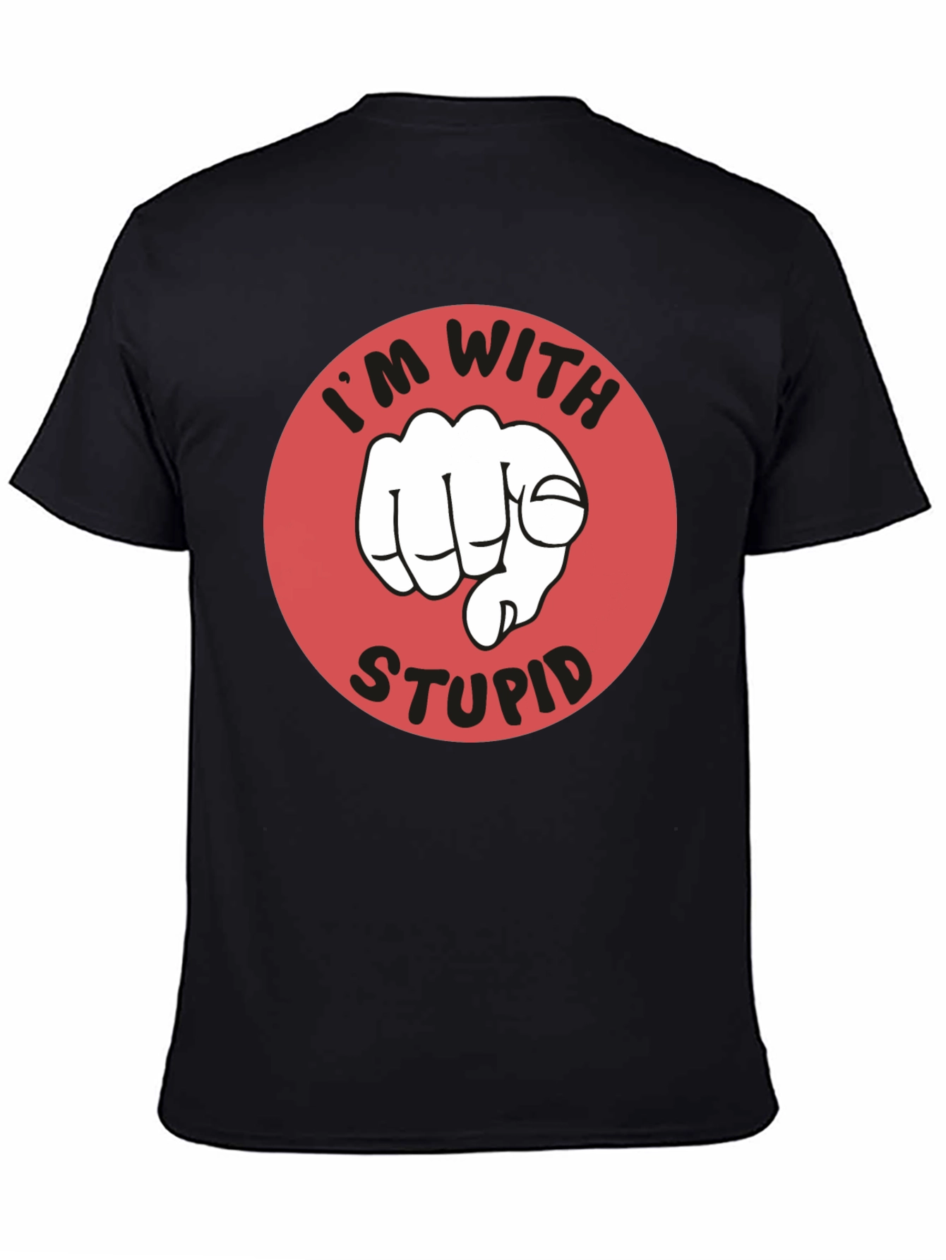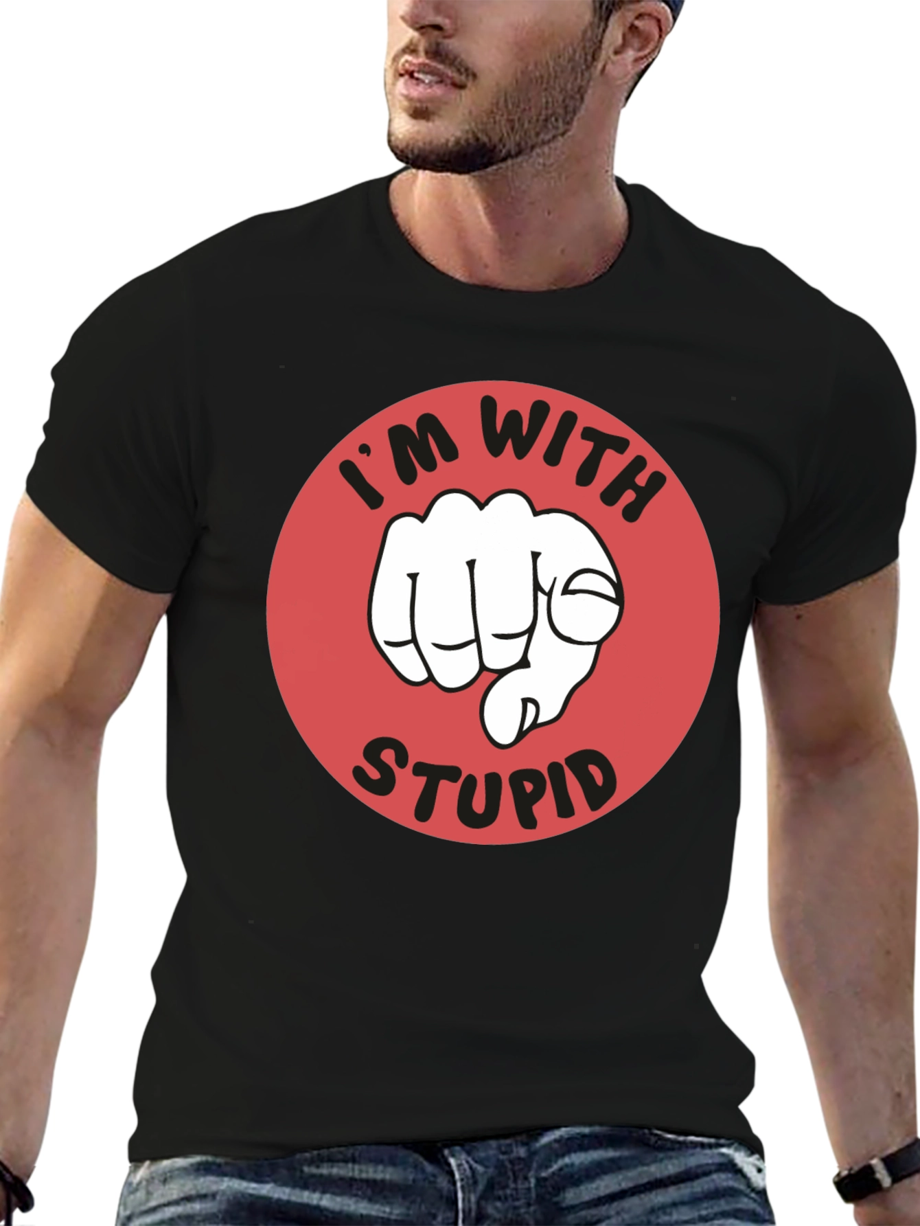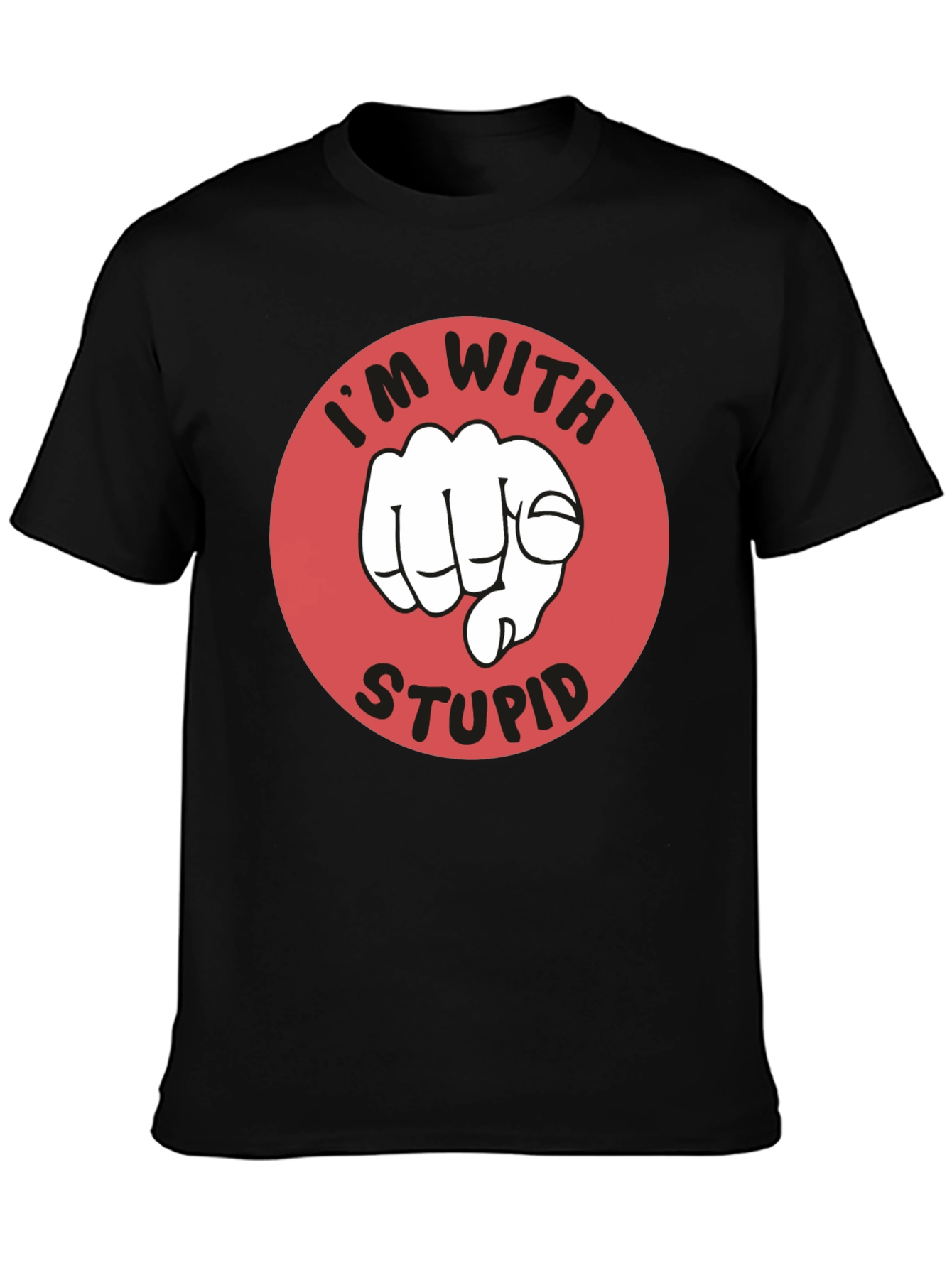 Destaca con esta llamativa camiseta negra de manga corta. El diseño presenta un círculo rojo audaz con una mano señalando y el texto "I'M WITH STUPID" en letras negras llamativas. Perfecta para expresar tu sentido del humor único, esta camiseta es ideal para fiestas, reuniones informales o simplemente para el uso diario. El diseño divertido y provocativo seguramente llamará la atención y generará conversaciones. Confeccionada con materiales suaves y cómodos, esta camiseta te mantendrá cómodo todo el día mientras haces una declaración audaz. ¡Atrévete a ser diferente y muestra tu personalidad con esta prenda única!