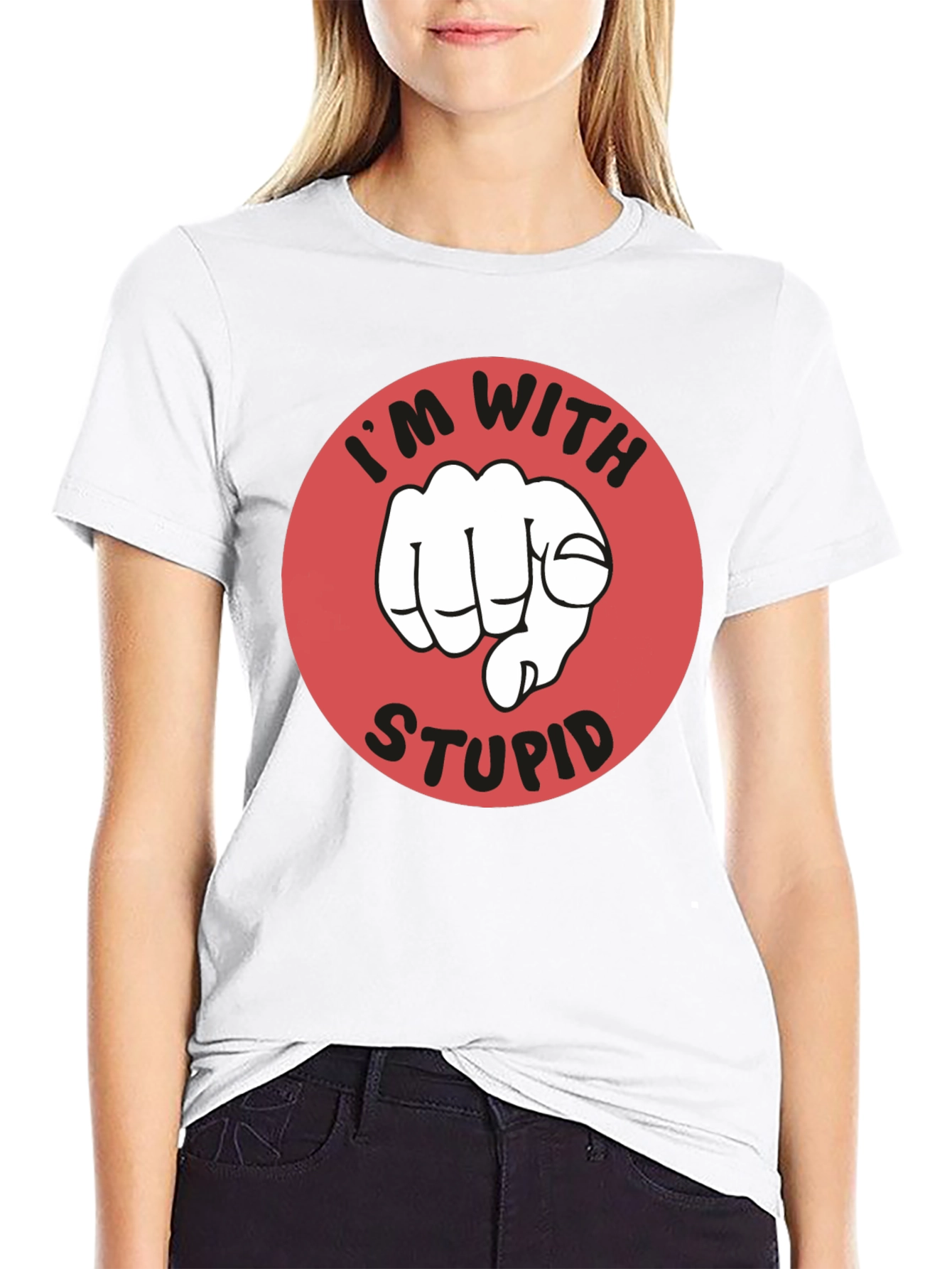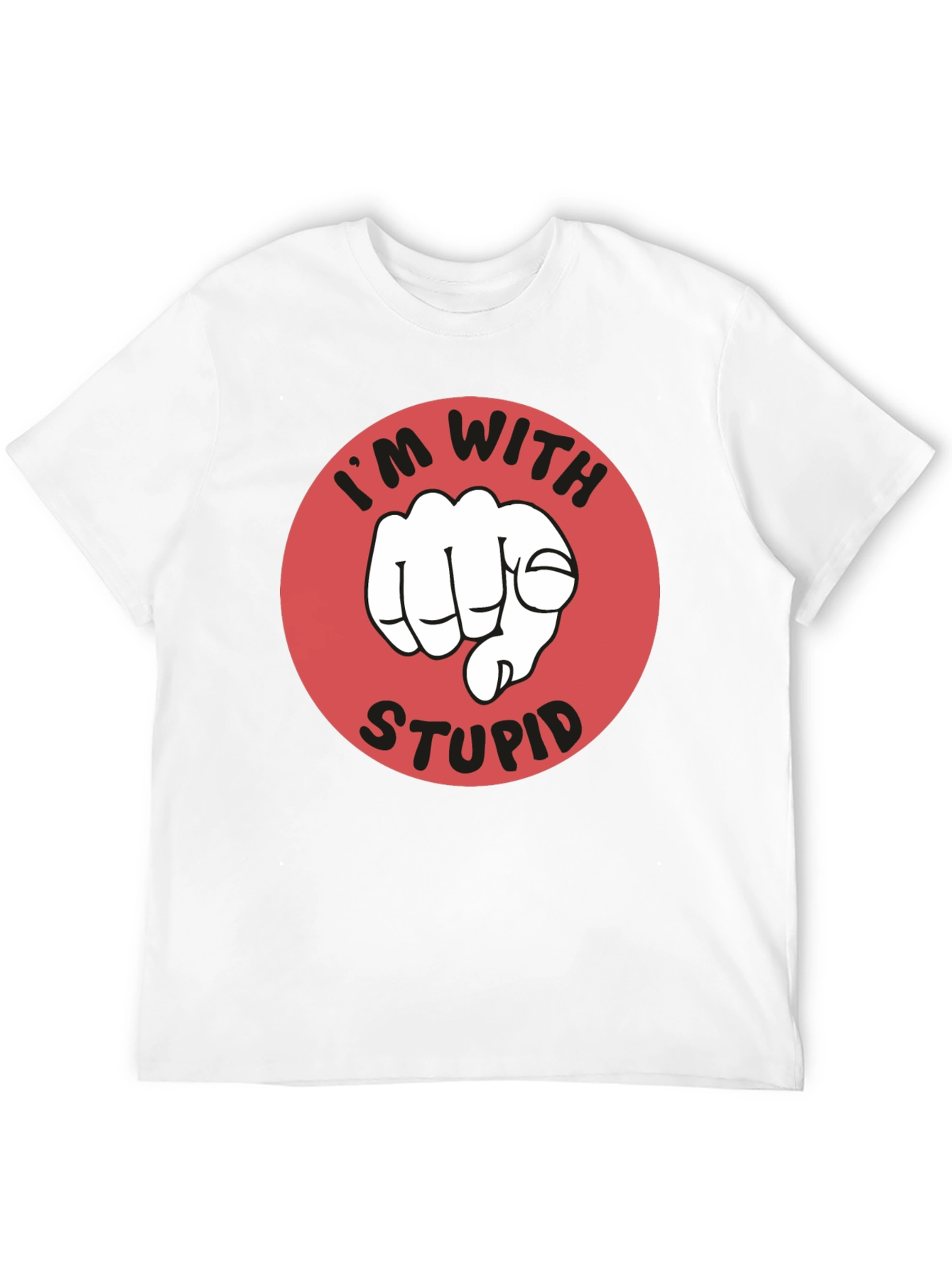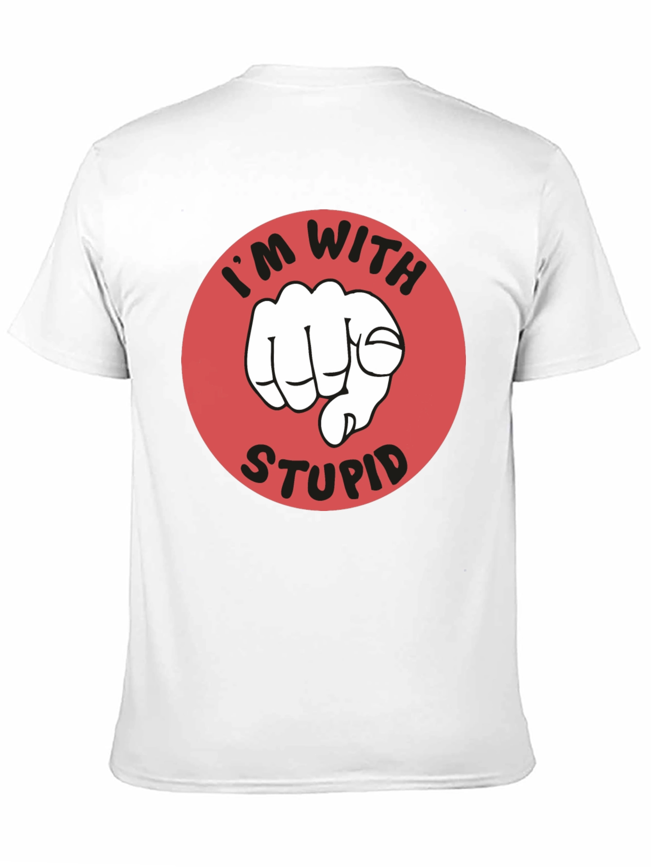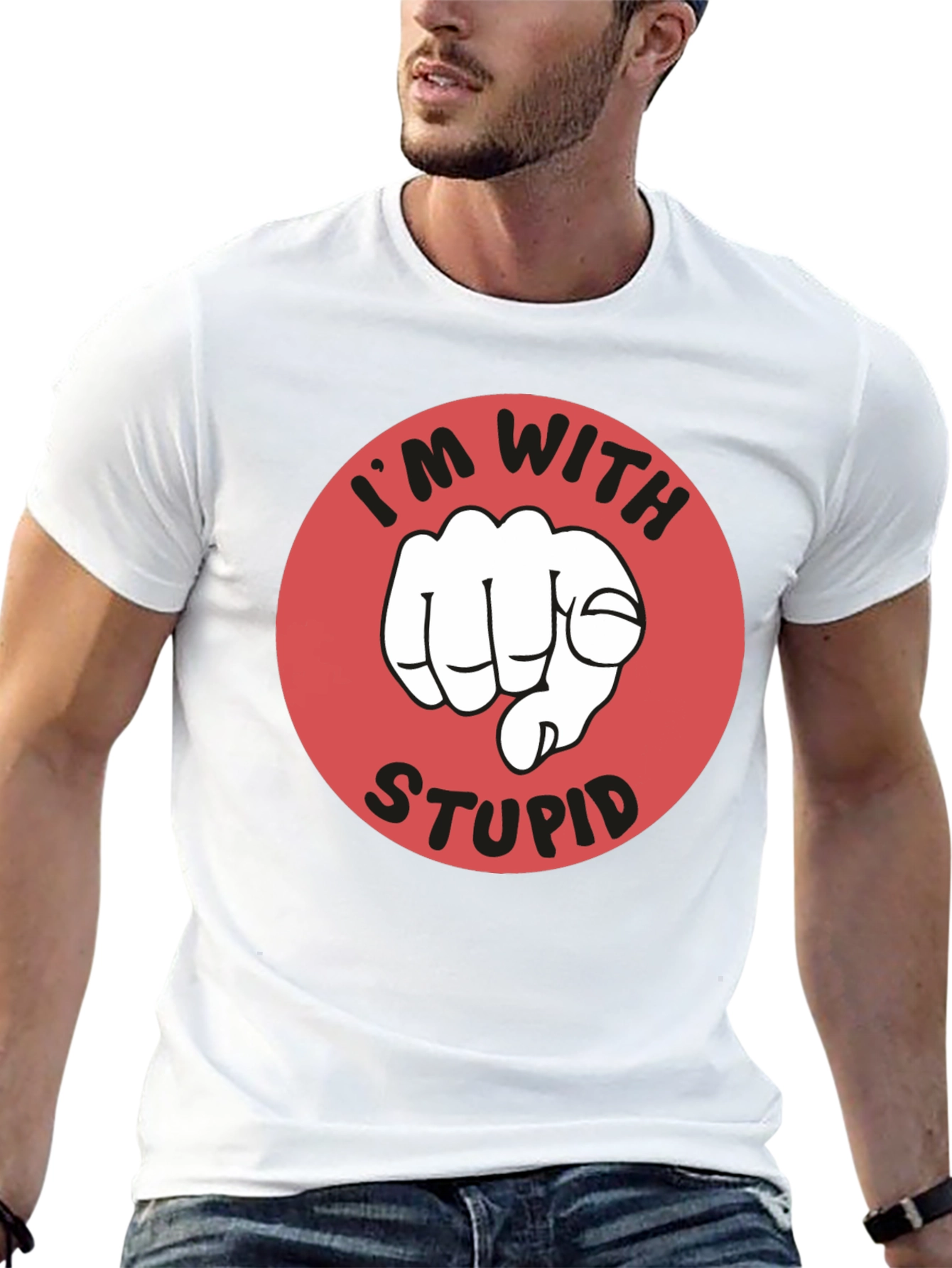 Destaca con esta llamativa camiseta negra de manga corta. El diseño presenta un círculo rojo audaz con una mano señalando y el texto "I'M WITH STUPID" en letras negras llamativas. Perfecta para expresar tu sentido del humor único, esta camiseta es ideal para fiestas, reuniones informales o simplemente para el uso diario. El diseño divertido y provocativo seguramente llamará la atención y generará conversaciones. Confeccionada con materiales suaves y cómodos, esta camiseta te mantendrá cómodo todo el día mientras haces una declaración audaz. ¡Atrévete a ser diferente y muestra tu personalidad con esta prenda única!