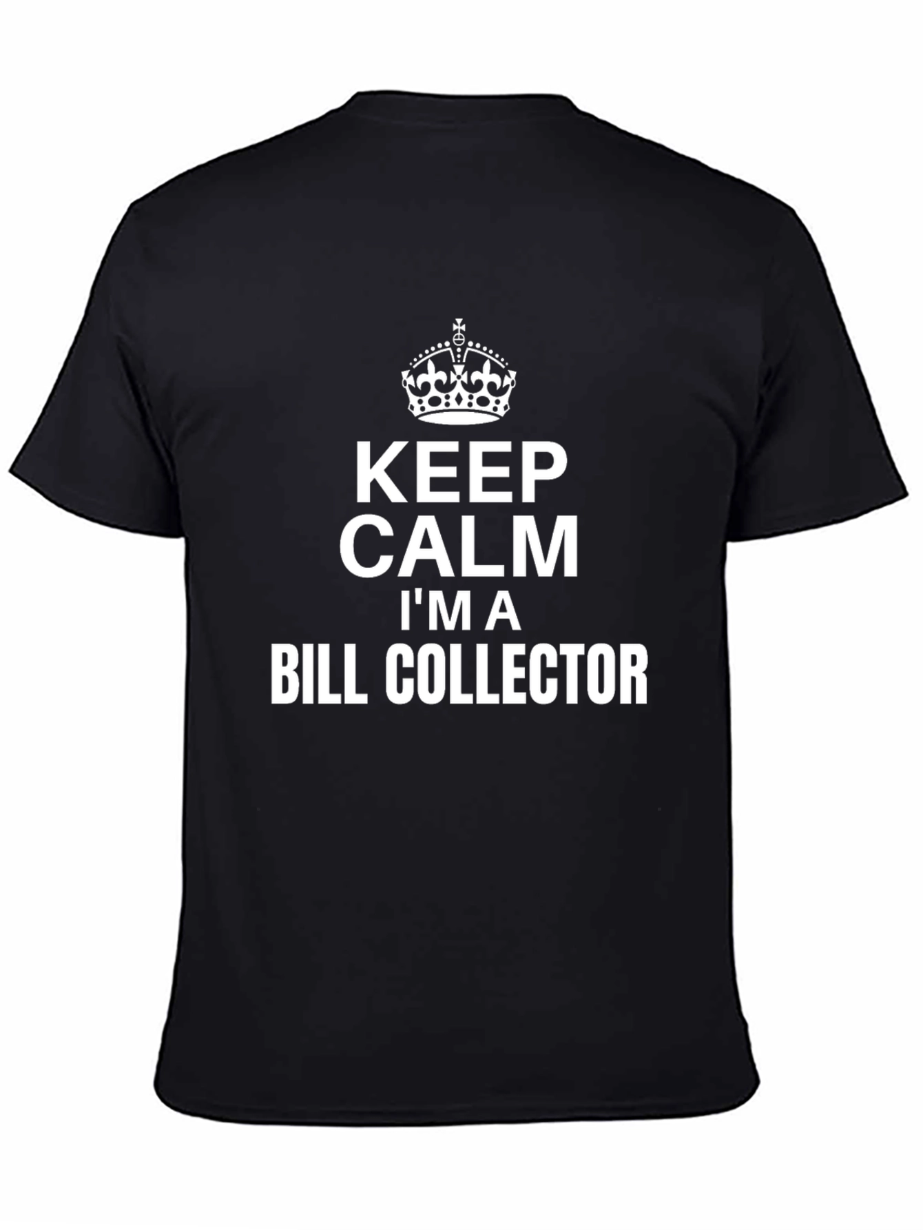 Esta camiseta negra presenta un diseño divertido y llamativo. En el centro, destaca el texto en blanco “KEEP CALM I’M A BILL COLLECTOR” (Mantén la calma, soy cobrador), coronado por una imagen de una corona estilizada. La camiseta parece estar hecha de un material suave y cómodo, ideal para uso casual. Su diseño único la convierte en una excelente opción para aquellos con sentido del humor, especialmente para quienes trabajan en finanzas o cobranzas. Ideal para usar en el trabajo, salidas informales o simplemente para relajarse en casa.