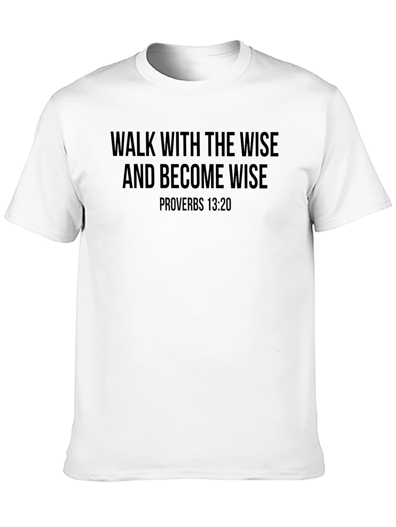 Luce esta elegante camiseta negra con un poderoso mensaje del libro de Proverbios 13:20: "Walk with the wise and become wise" ("Anda con sabios y serás sabio"). Esta prenda de vestir, aparentemente confeccionada en suave algodón, presenta un diseño minimalista con la frase impresa en una tipografía clara y legible. Su color negro sólido la convierte en una opción versátil para combinar con cualquier atuendo casual. Ideal para expresar tu fe y valores de una manera sutil y moderna, esta camiseta es perfecta para usar en reuniones informales, salidas con amigos o simplemente para relajarte en casa. Su mensaje inspirador te recordará la importancia de la compañía sabia en tu vida. ¡Una prenda con significado y estilo!