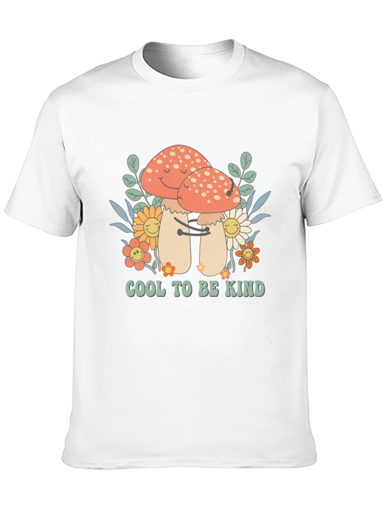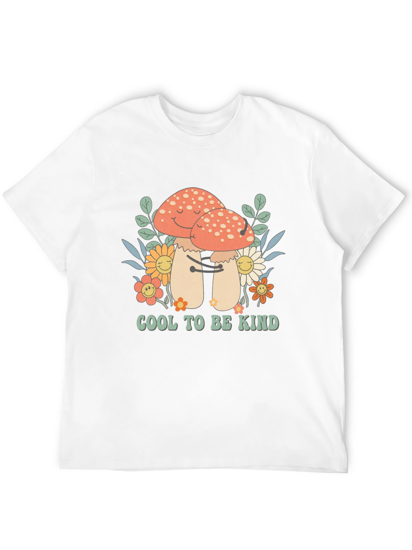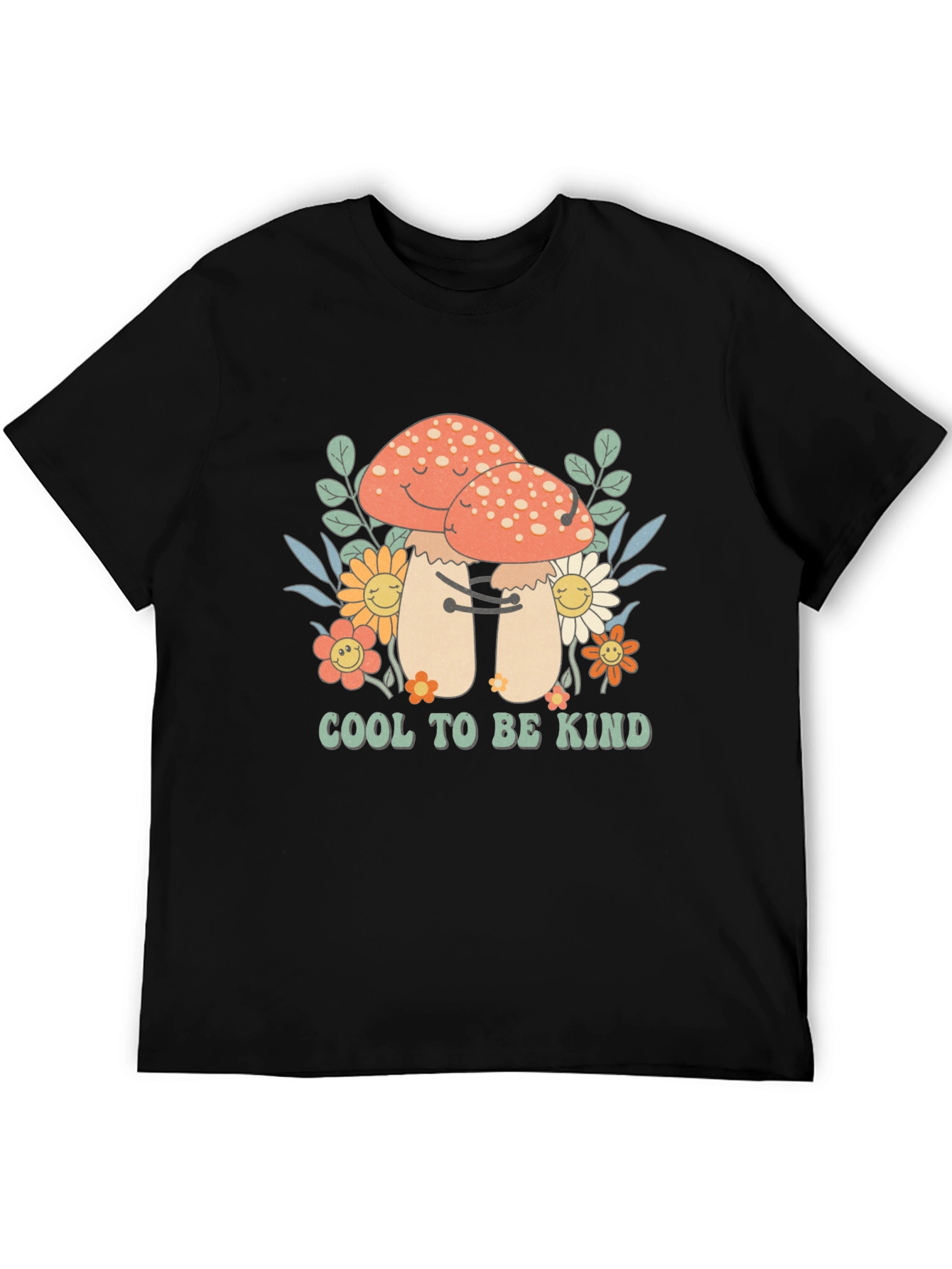 Luce esta divertida camiseta negra con un diseño entrañable de dos setas abrazándose, rodeadas de flores y hojas coloridas. El mensaje "COOL TO BE KIND" (Genial ser amable) añade un toque positivo y de buen rollo a tu vestuario. Perfecta para quienes buscan una prenda original y con un mensaje inspirador. Ideal para combinar con jeans, faldas o pantalones casuales. ¡Añade un toque de alegría y positividad a tu día a día con esta camiseta única!