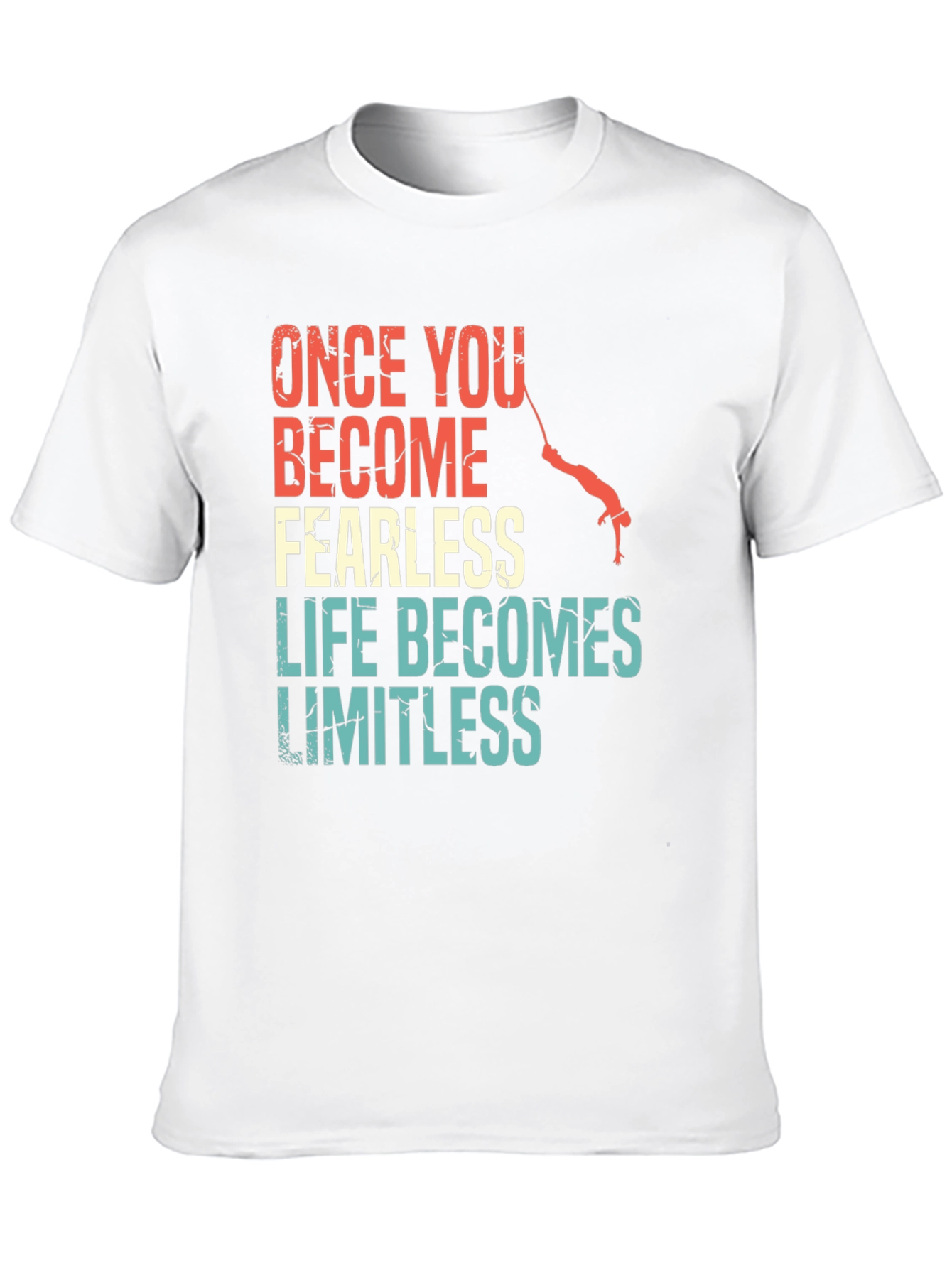 Luce esta llamativa camiseta negra con un diseño inspirador. En ella se lee "Once You Become Fearless, Life Becomes Limitless" (Una vez que eres imparable, la vida se vuelve ilimitada) en letras de estilo retro con un efecto desgastado, combinando los colores rojo, beige y azul aguamarina. Además, incluye la silueta de una persona saltando desde una cuerda, evocando una sensación de aventura y libertad. Esta camiseta de manga corta y corte clásico es perfecta para usar a diario, ideal para motivarte y recordarte que no hay límites. Fabricada con materiales suaves y cómodos, esta camiseta es perfecta para cualquier ocasión informal. ¡Inspira a otros con esta prenda única y llena de energía positiva!
