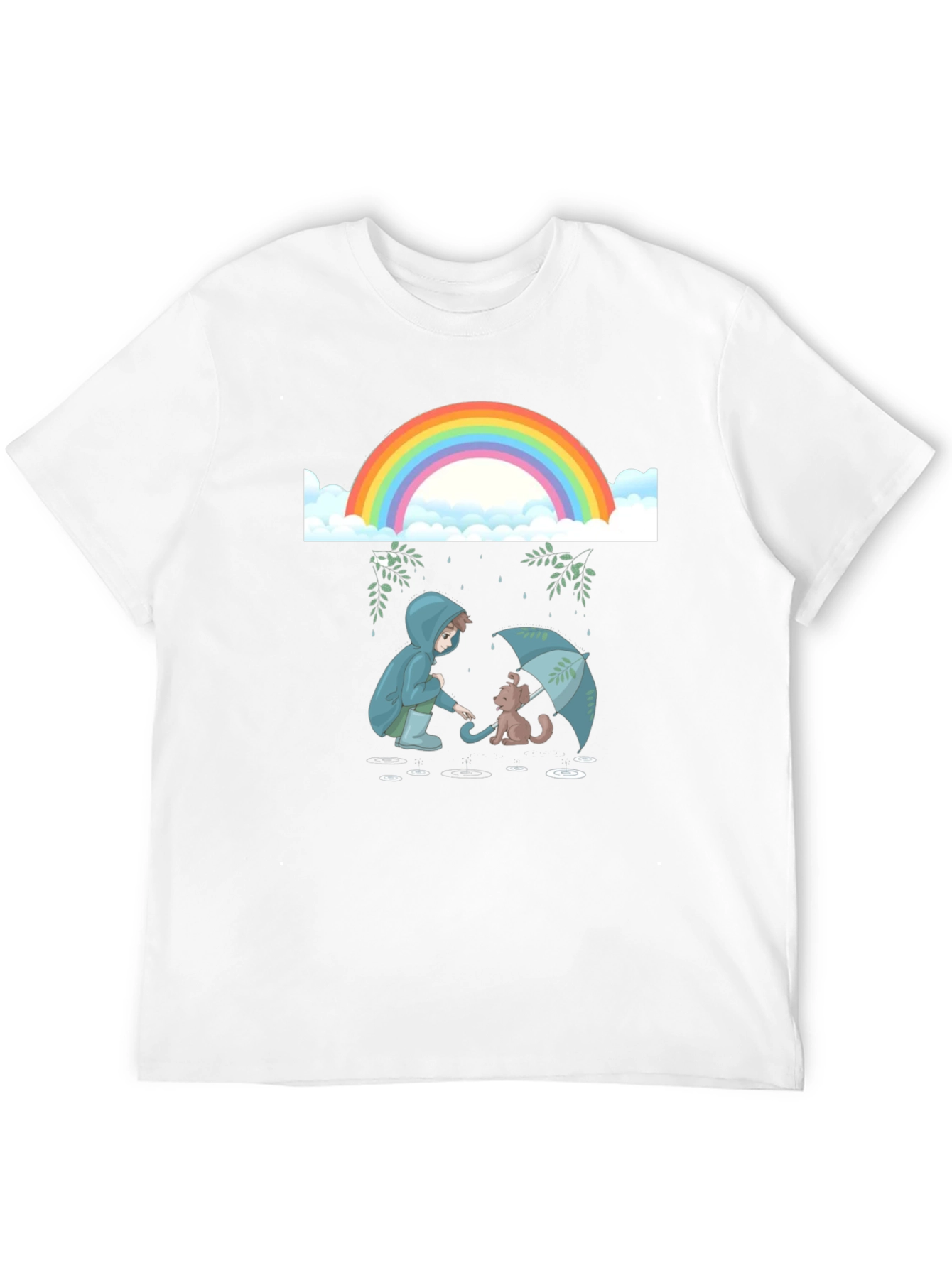 Esta camiseta negra presenta un diseño encantador y colorido. En la parte superior, se muestra un vibrante arcoíris que emerge de unas nubes blancas. Debajo, se aprecia una tierna escena bajo la lluvia: una persona con impermeable azul protege a un adorable gatito con un paraguas. El diseño evoca alegría y protección, ideal para expresar un estilo divertido y optimista. Fabricada con materiales suaves y cómodos, esta camiseta es perfecta para usar en el día a día, ya sea para un look casual o para destacar con un toque original. Su diseño único la convierte en una excelente opción para regalar a los amantes de los animales y los colores vivos.
