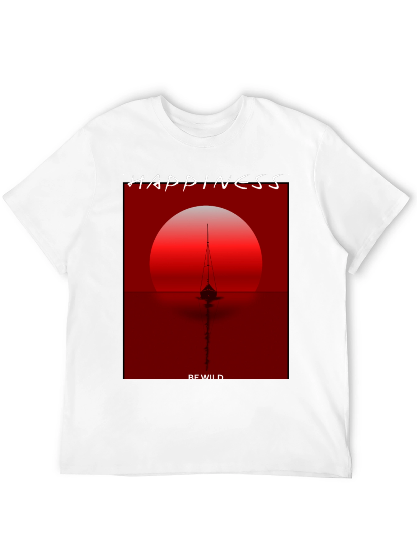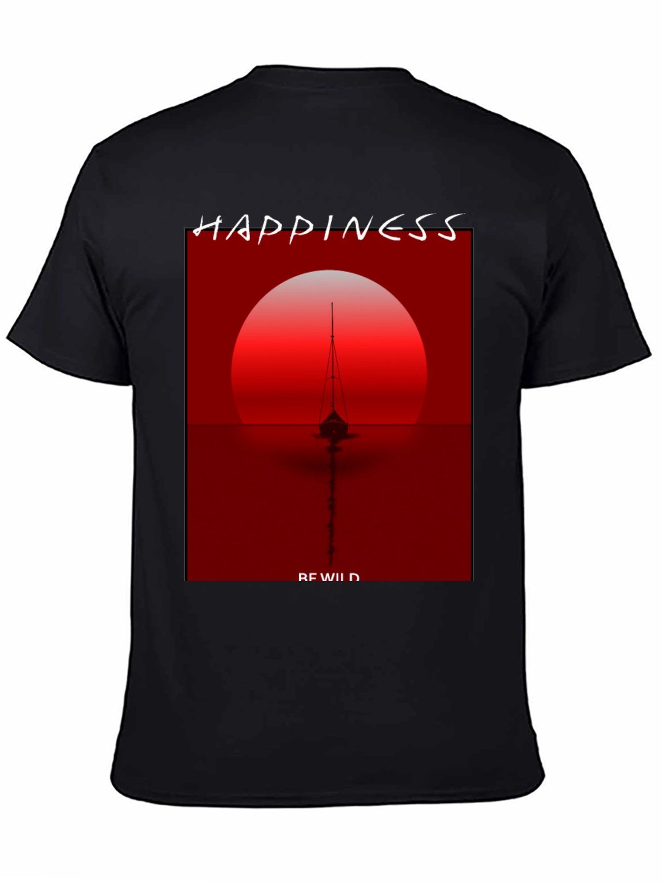 Luce esta elegante camiseta negra con un impresionante diseño que captura la magia de un atardecer en el mar. La imagen presenta un sol rojo intenso que se refleja en el agua, con un velero solitario en el horizonte. La frase "HAPPINESS BE WILD" añade un toque inspirador y aventurero. Esta camiseta de corte clásico es perfecta para cualquier ocasión casual. Combínala con tus jeans favoritos para un look relajado o úsala debajo de una chaqueta para un estilo más sofisticado. Fabricada con materiales suaves y cómodos, te garantiza frescura y confort durante todo el día. Ideal para aquellos que buscan expresar su pasión por la naturaleza y la libertad.