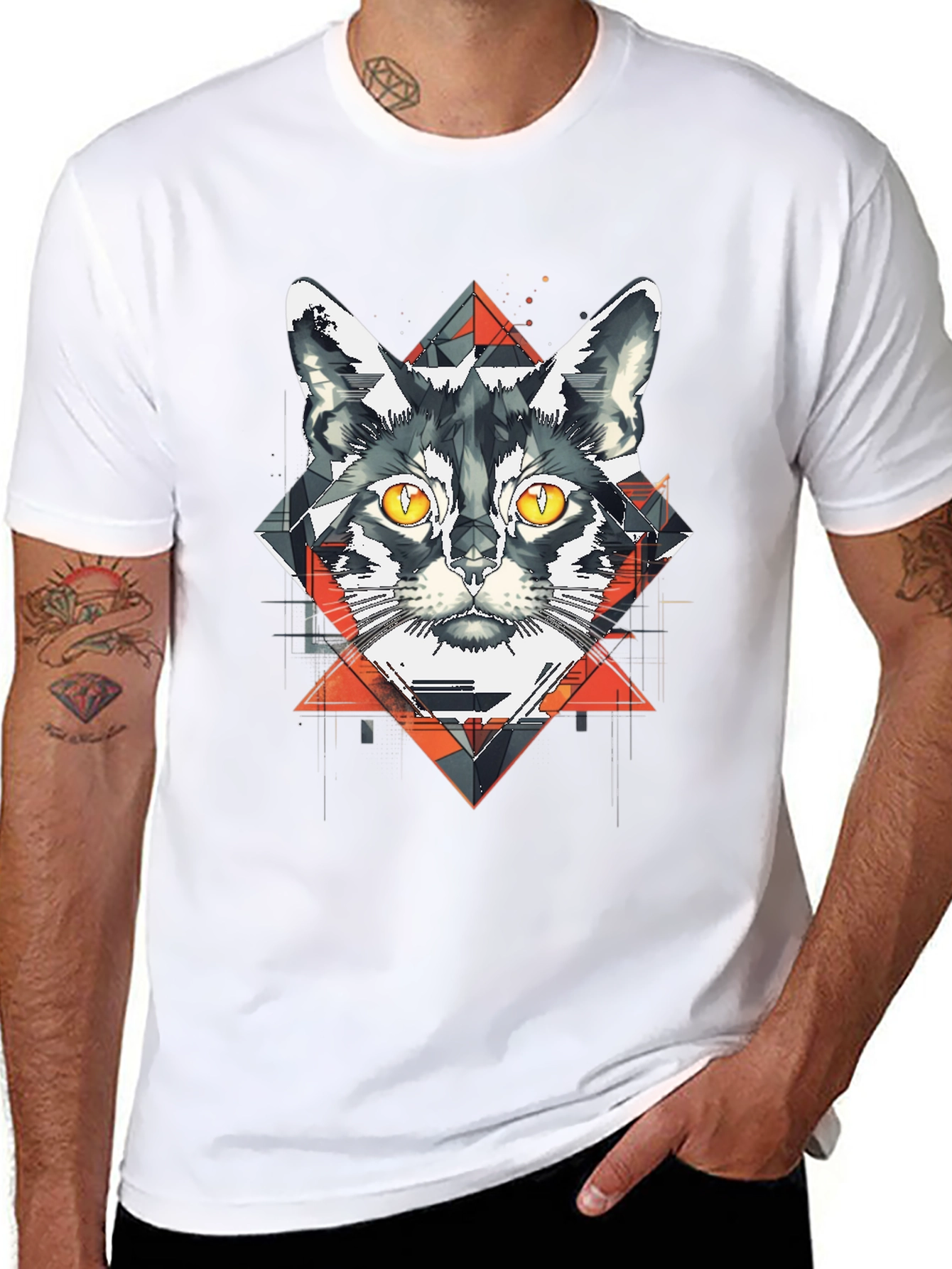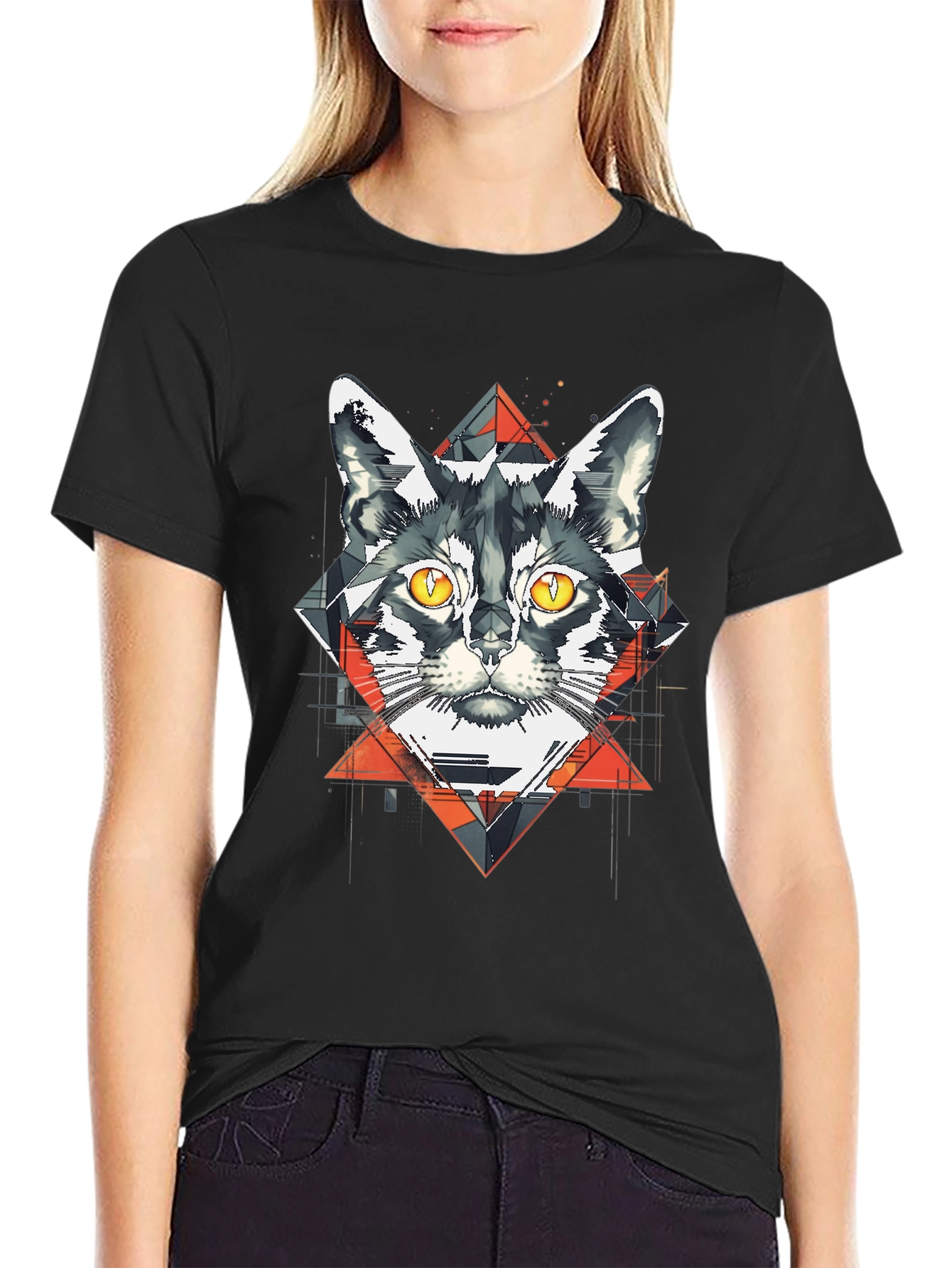 Destaca con esta original camiseta negra de manga corta que presenta un llamativo diseño de un gato con estilo geométrico. El estampado central muestra la cara de un gato en tonos grises y blancos, con intensos ojos amarillos que capturan la atención. El diseño se complementa con un fondo de figuras geométricas triangulares en tonos naranja y gris, creando un look moderno y artístico. Perfecta para expresar tu personalidad y amor por los felinos con un toque vanguardista. Ideal para uso diario, eventos informales o como un regalo único para amantes de los gatos y el arte.