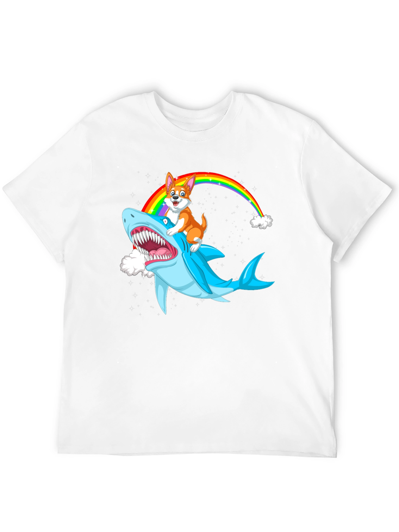 Luce esta original camiseta negra con un estampado llamativo y lleno de color. Presenta un adorable perro corgi montado en un tiburón sonriente, sobre un fondo de estrellas y un arcoíris brillante. El diseño es moderno y divertido, perfecto para añadir un toque de alegría a tu guardarropa. Ideal para un estilo casual y relajado. Fabricada con materiales suaves y cómodos para usarla todo el día. ¡Esta camiseta es una excelente opción para expresar tu personalidad y destacar con un toque de humor!