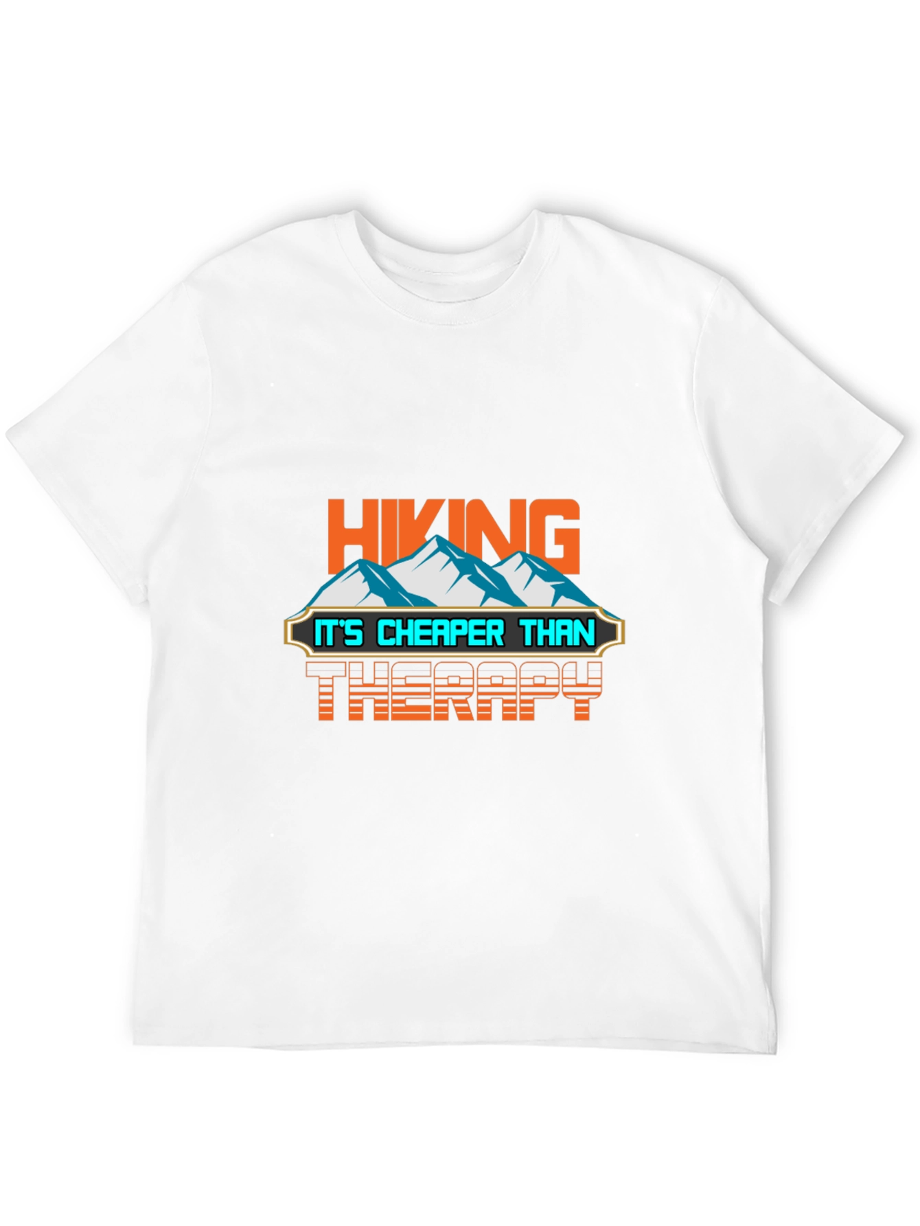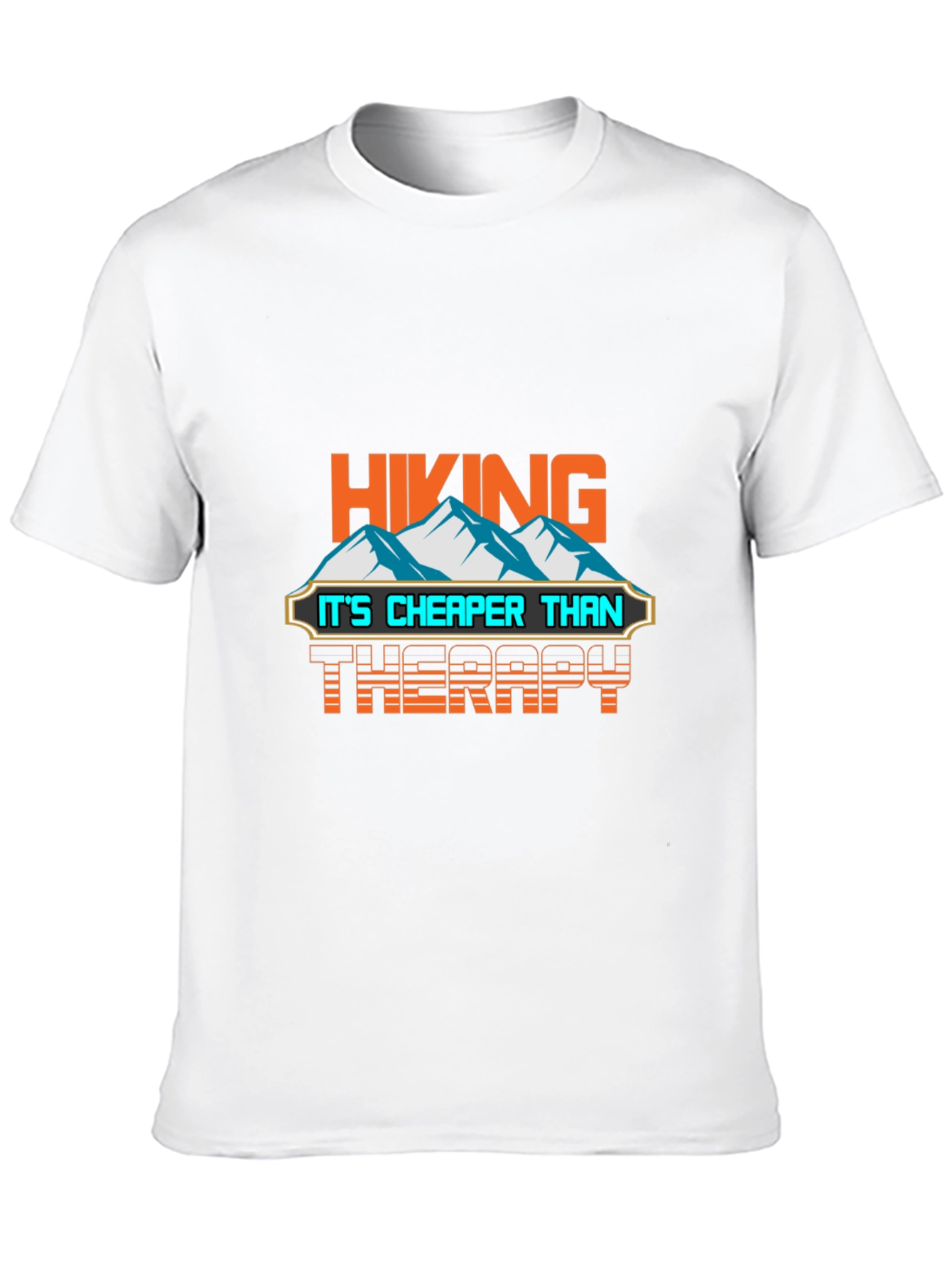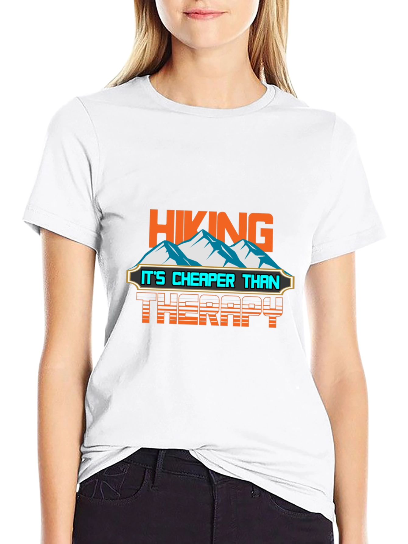 Descubre esta divertida camiseta negra con un diseño llamativo perfecto para los amantes del senderismo. La camiseta presenta un gráfico en tonos naranja y azul que incluye la frase "Hiking, it's cheaper than therapy" (Senderismo, es más barato que la terapia) acompañada de montañas estilizadas. Fabricada en un material suave y cómodo, ideal para usar en tus aventuras al aire libre o simplemente para un look casual y relajado. Esta camiseta es una excelente opción para expresar tu pasión por la naturaleza y el deporte con un toque de humor. ¡Luce este diseño único y anima a otros a explorar el mundo!