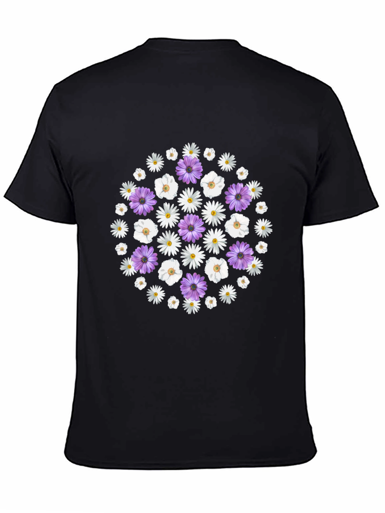 Esta camiseta negra de manga corta presenta un llamativo diseño floral centrado en el pecho. El estampado consiste en una composición circular de margaritas blancas y flores moradas, ofreciendo un atractivo contraste sobre el fondo oscuro. Ideal para un look casual y moderno, esta camiseta es perfecta para el día a día o para ocasiones informales. Su diseño versátil la convierte en una prenda fácil de combinar con jeans, pantalones cortos o faldas. Confeccionada con materiales cómodos y suaves al tacto, garantiza una experiencia de uso agradable durante todo el día. Dale un toque de frescura y estilo floral a tu armario con esta camiseta única.