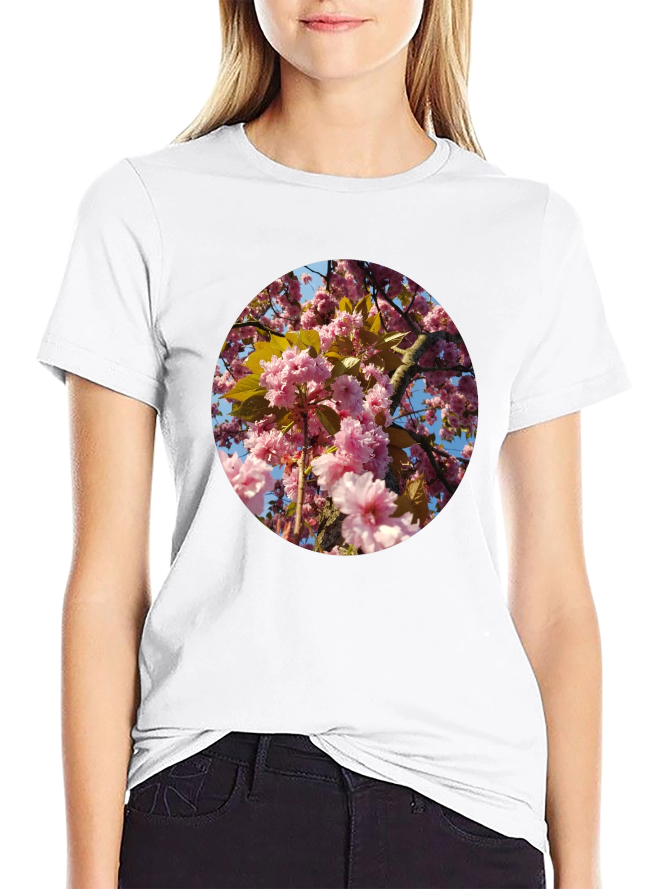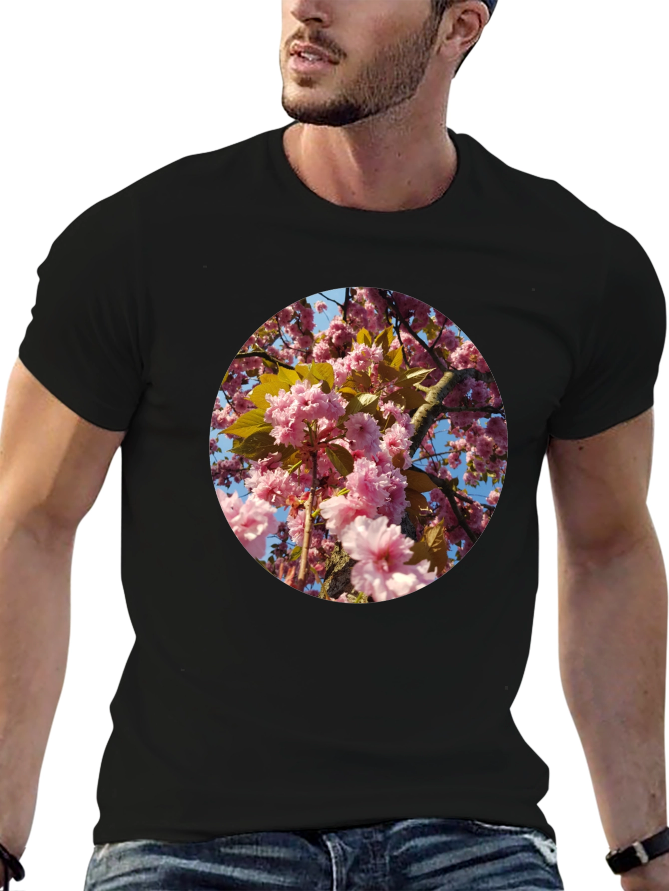 Luce esta moderna camiseta negra con un llamativo diseño floral rosado. El estampado circular presenta flores de cerezo en plena floración, creando un efecto visual atractivo y fresco. Perfecta para un look casual y relajado, esta camiseta es ideal para combinar con jeans, pantalones cortos o faldas. Su corte clásico garantiza comodidad y estilo. Ideal para uso diario, paseos al aire libre o para expresar tu amor por la naturaleza. Añade un toque de color y originalidad a tu guardarropa con esta prenda única.