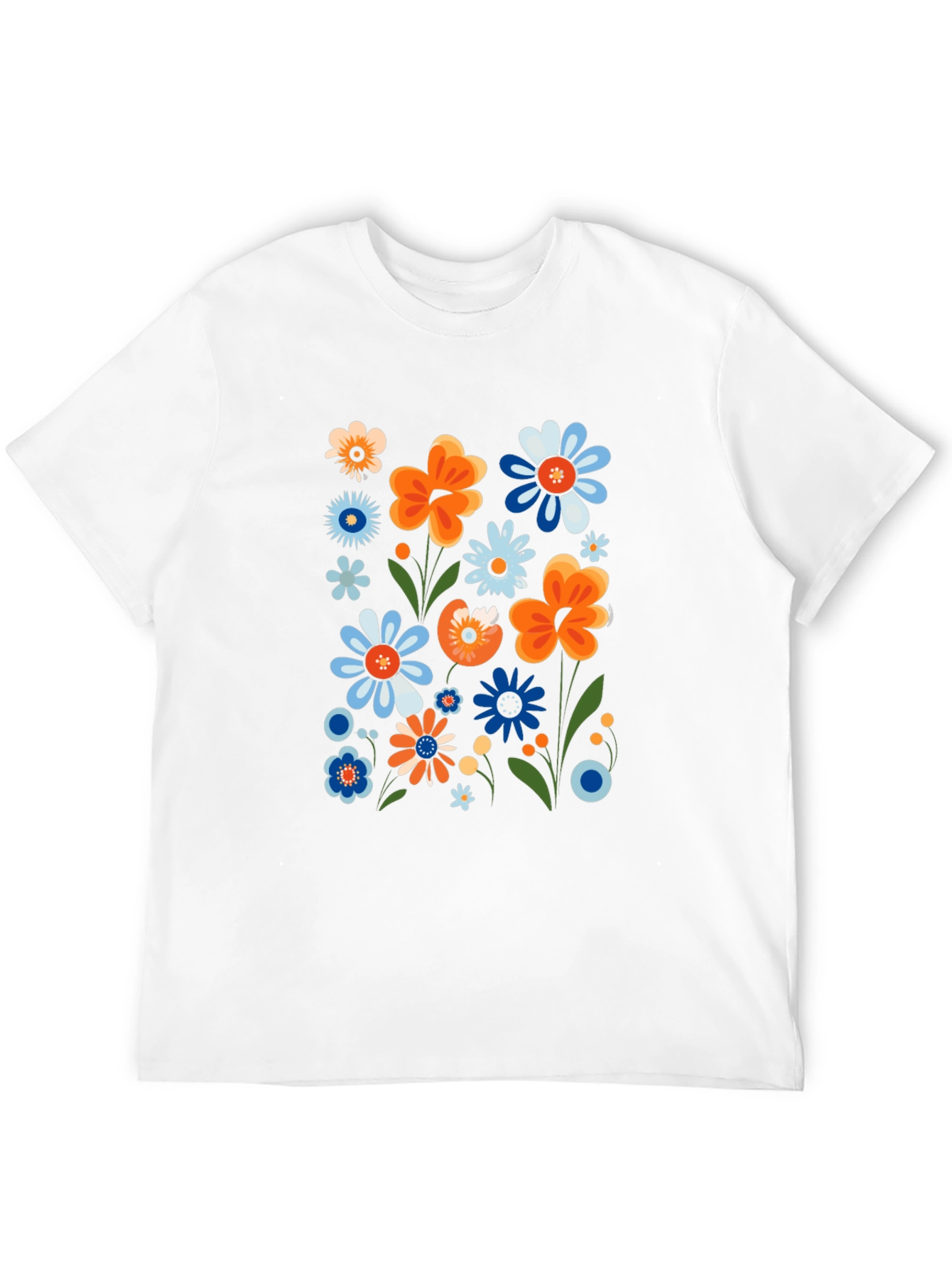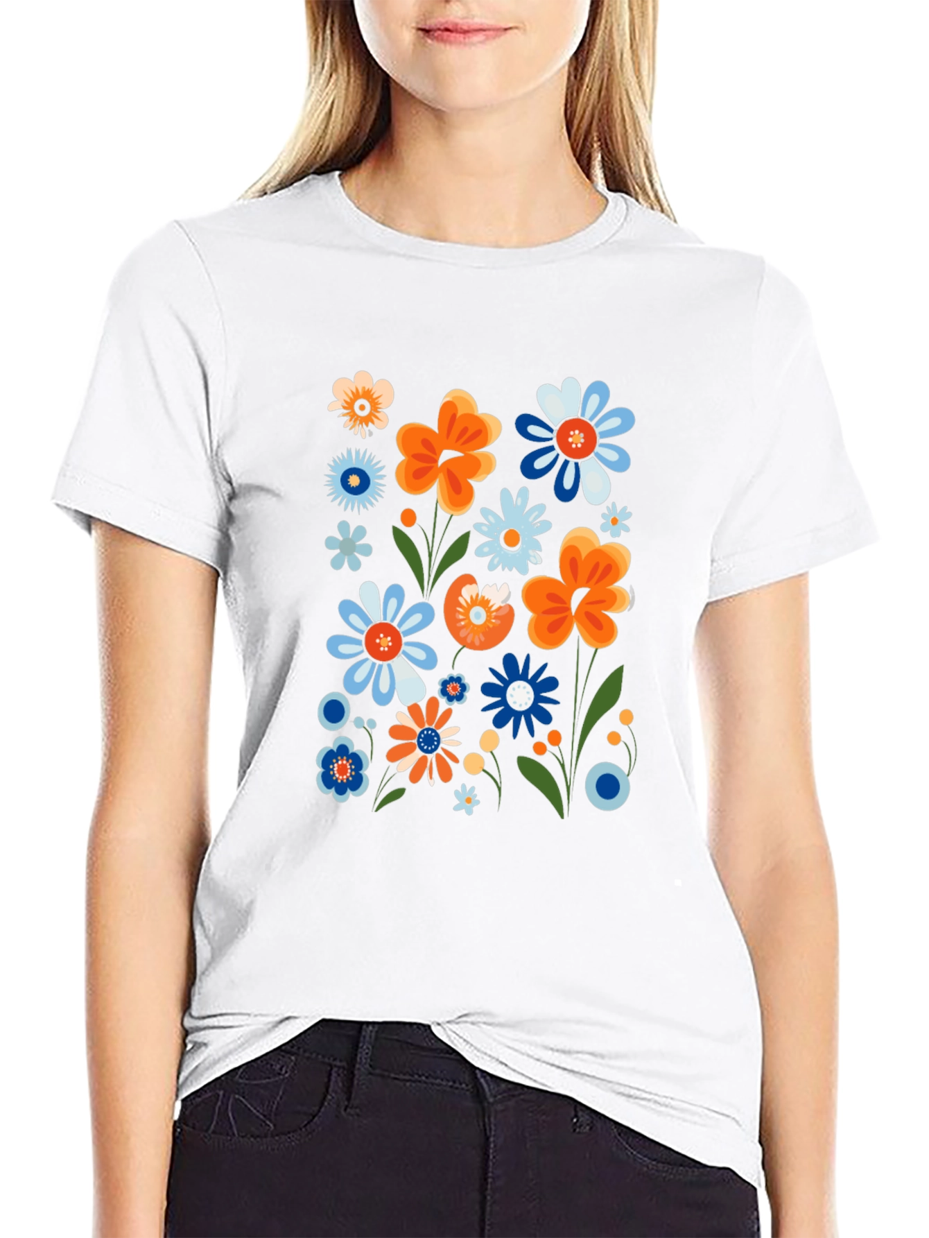Luce un estilo vibrante y lleno de color con esta llamativa camiseta negra. Presenta un alegre estampado floral retro con una variedad de flores estilizadas en tonos naranja y azul sobre un fondo negro clásico. El diseño crea un contraste visual impactante, ideal para añadir un toque de personalidad a tu vestuario diario. Confeccionada en un tejido suave y cómodo, esta camiseta es perfecta para el uso diario, ya sea para una salida casual o para relajarte en casa. Su corte clásico y versátil se adapta a cualquier estilo y ocasión. Combínala con jeans, pantalones cortos o faldas para crear looks únicos y expresivos. ¡Deja que tu estilo florezca con esta camiseta única!