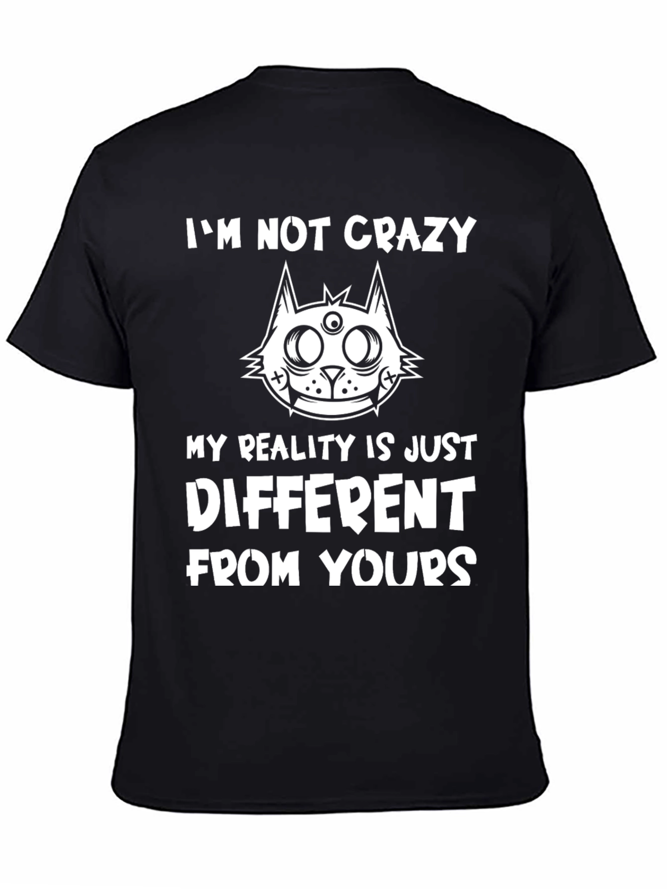 Exprésate con esta llamativa camiseta negra de manga corta. Presenta un diseño único de un gato de dibujos animados con un tercer ojo y la frase "I'm not crazy, my reality is just different from yours" (No estoy loco, mi realidad es simplemente diferente a la tuya). Perfecta para aquellos que aman destacar y mostrar su lado peculiar. Hecha de un material suave y cómodo, ideal para uso diario. Combina esta camiseta con tus jeans o pantalones favoritos para un look casual y con personalidad. ¡Muestra tu individualidad con estilo!