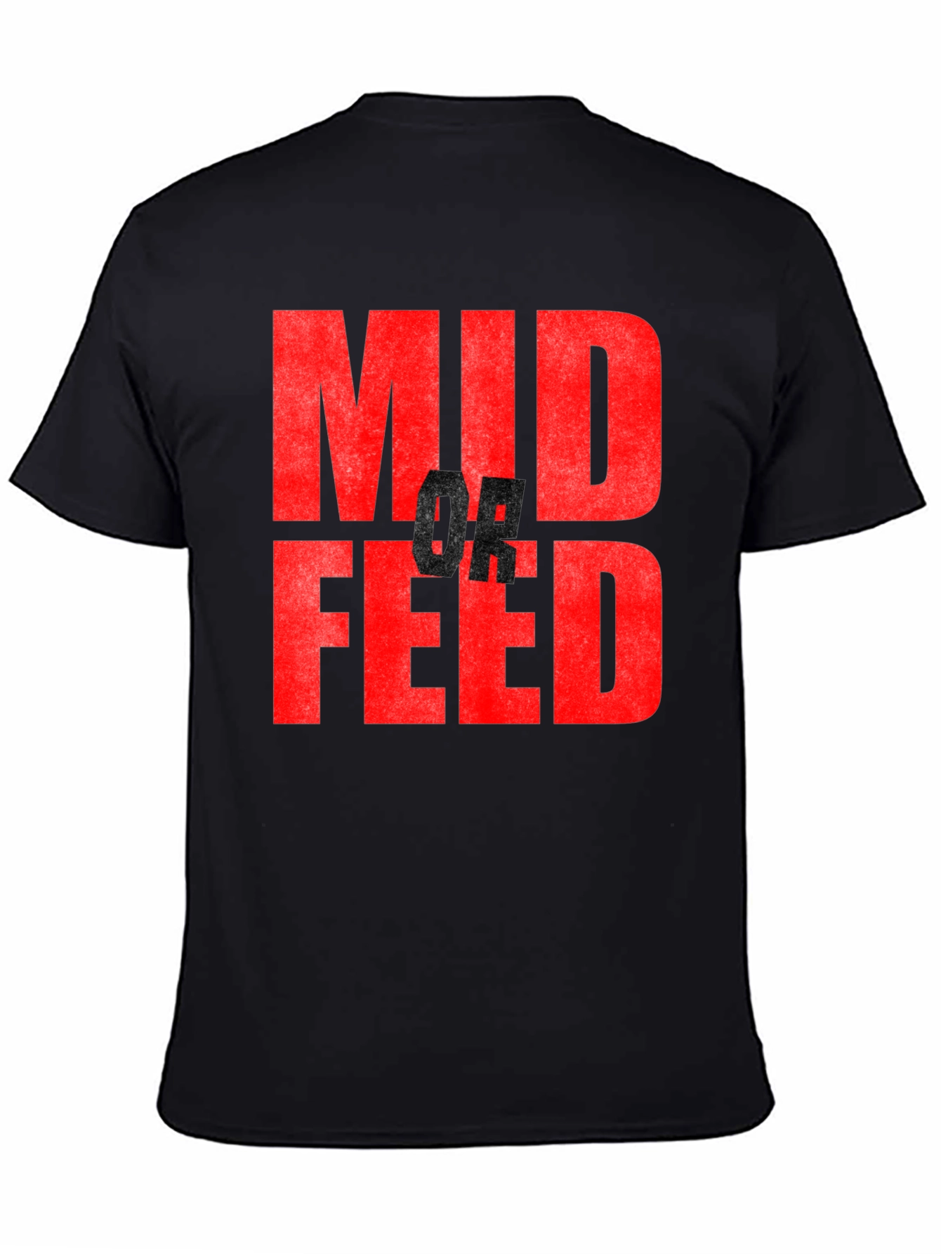 Luce esta original camiseta negra con un diseño audaz y moderno. La frase "Mid or Feed" impresa en rojo y negro le da un toque llamativo y divertido. Fabricada con materiales de alta calidad, esta camiseta es cómoda y duradera, perfecta para usar en el día a día. Su diseño único la convierte en una prenda ideal para expresar tu personalidad y destacar entre la multitud. Combínala con tus jeans favoritos para un look casual y relajado, o úsala para mostrar tu pasión por los videojuegos. ¡Consigue la tuya y marca la diferencia!