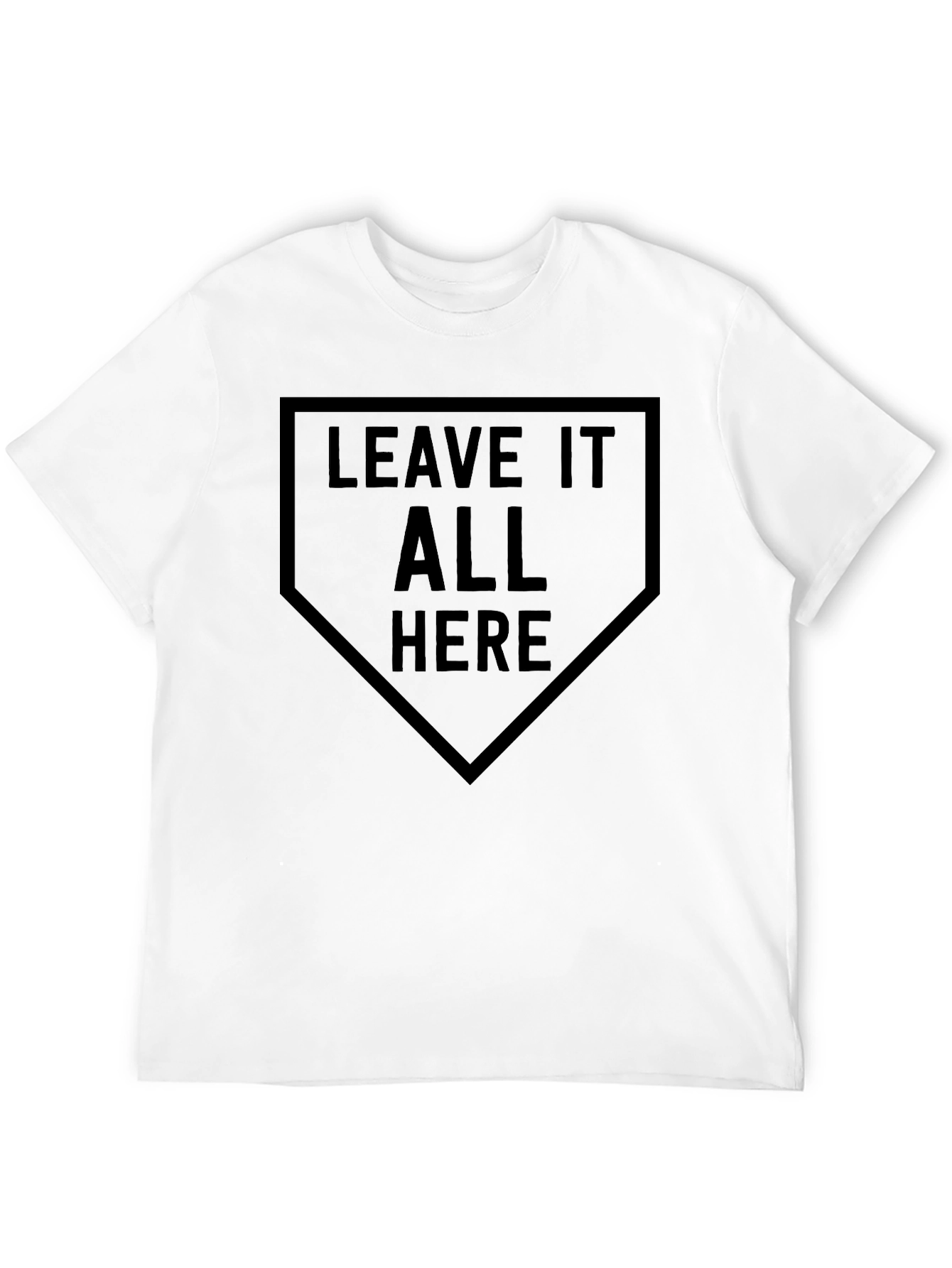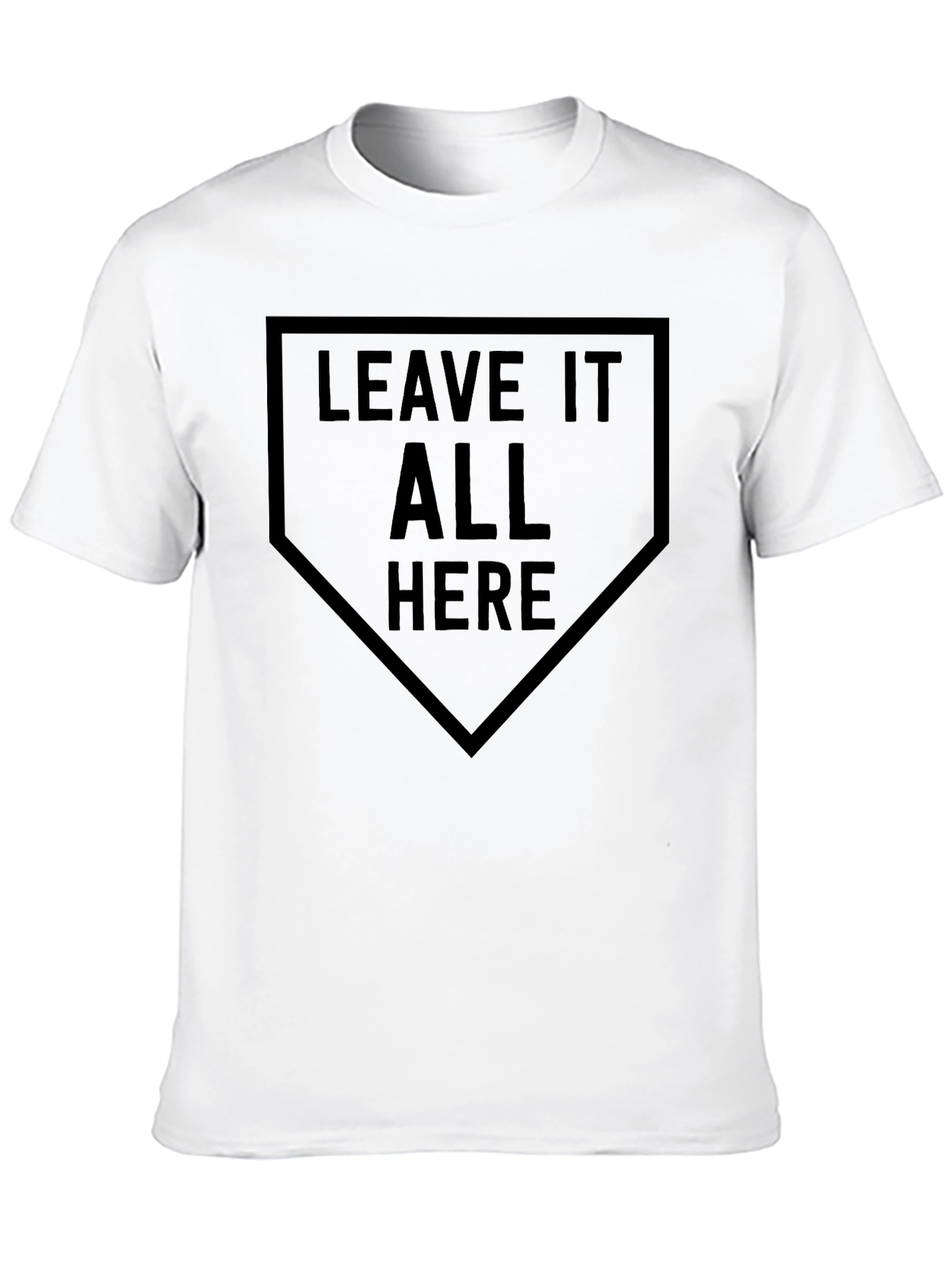 Esta camiseta negra de manga corta presenta un diseño llamativo y motivador. En el centro del pecho, se destaca la frase "LEAVE IT ALL HERE" inscrita dentro de la silueta de un campo de béisbol, sugiriendo un mensaje de entrega total y esfuerzo máximo. Fabricada con un material suave y cómodo, parece ser ideal para actividades deportivas o uso casual diario. Su color negro sólido la hace versátil y fácil de combinar con cualquier atuendo. Perfecta para atletas, entusiastas del deporte o cualquiera que busque una prenda con un toque inspirador y moderno.