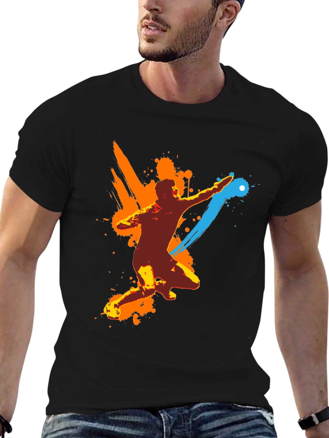 Esta camiseta negra presenta un diseño artístico y deportivo. El estampado muestra una figura en movimiento con trazos de color naranja y azul, creando un efecto dinámico y moderno. Fabricada con un tejido suave y cómodo, es perfecta para actividades deportivas o para un look casual con estilo. Su diseño único la convierte en una prenda llamativa, ideal para expresar tu personalidad activa y creativa. Combínala con tus jeans o shorts favoritos y destaca en cualquier ocasión con esta original camiseta.