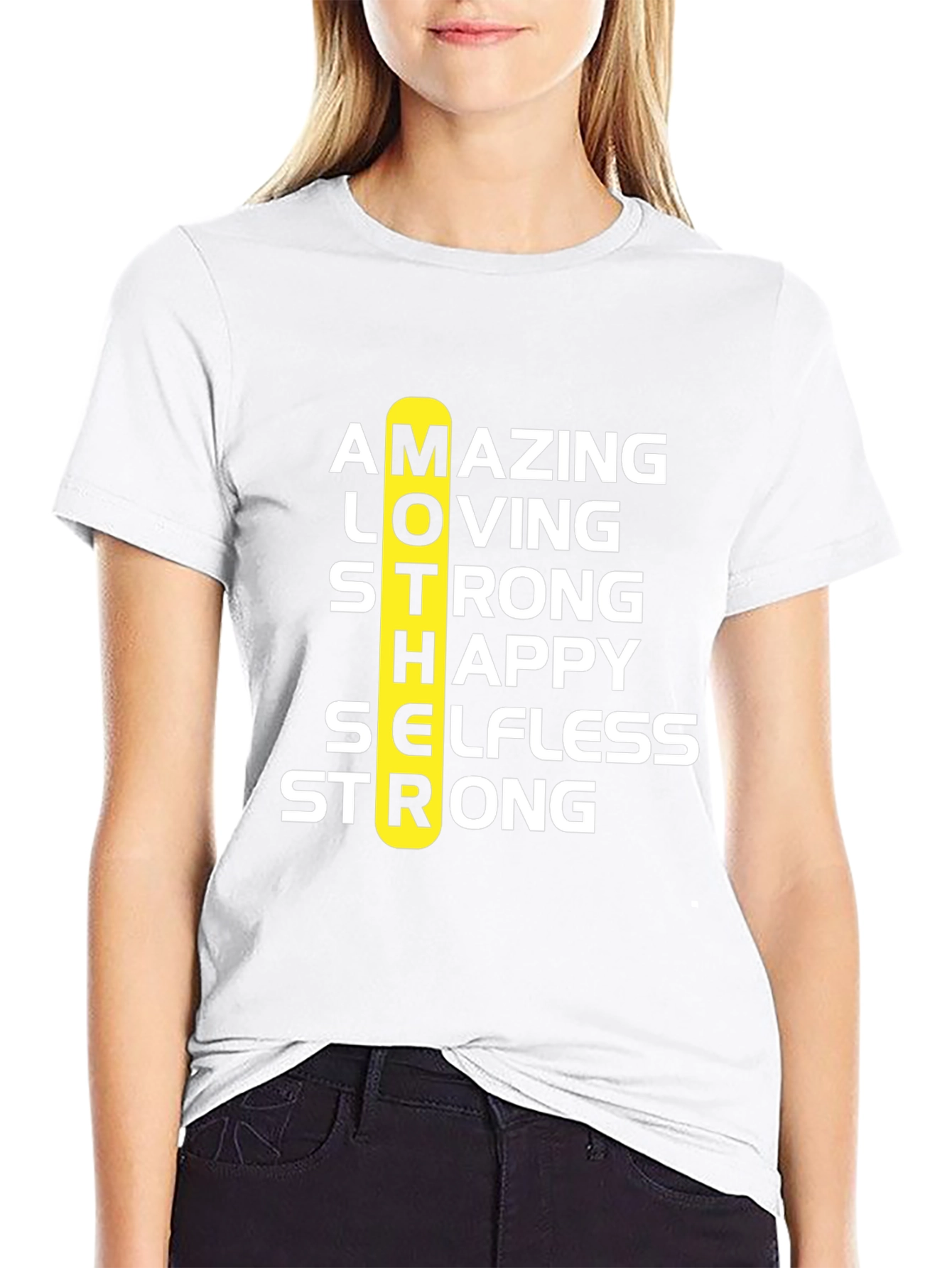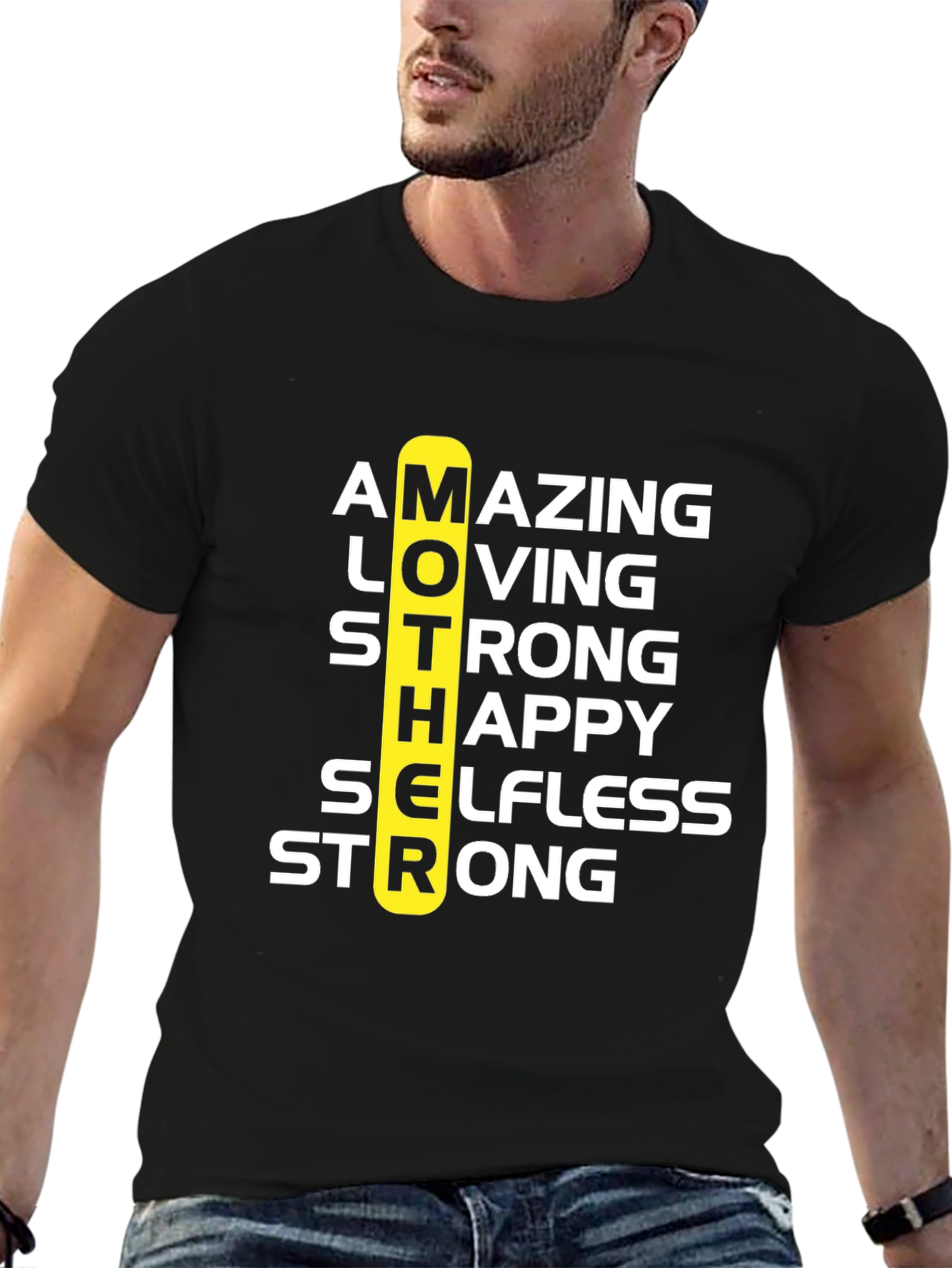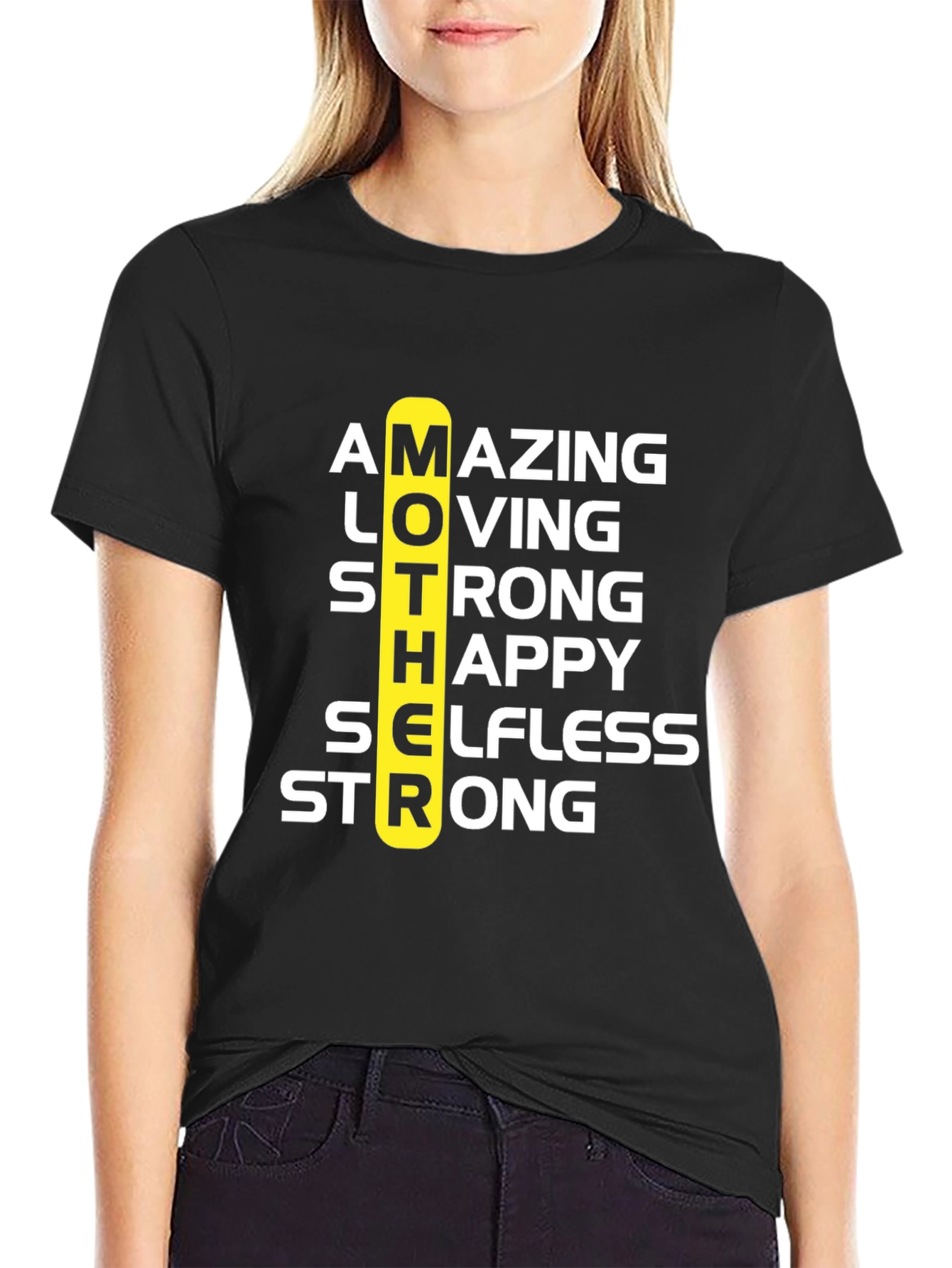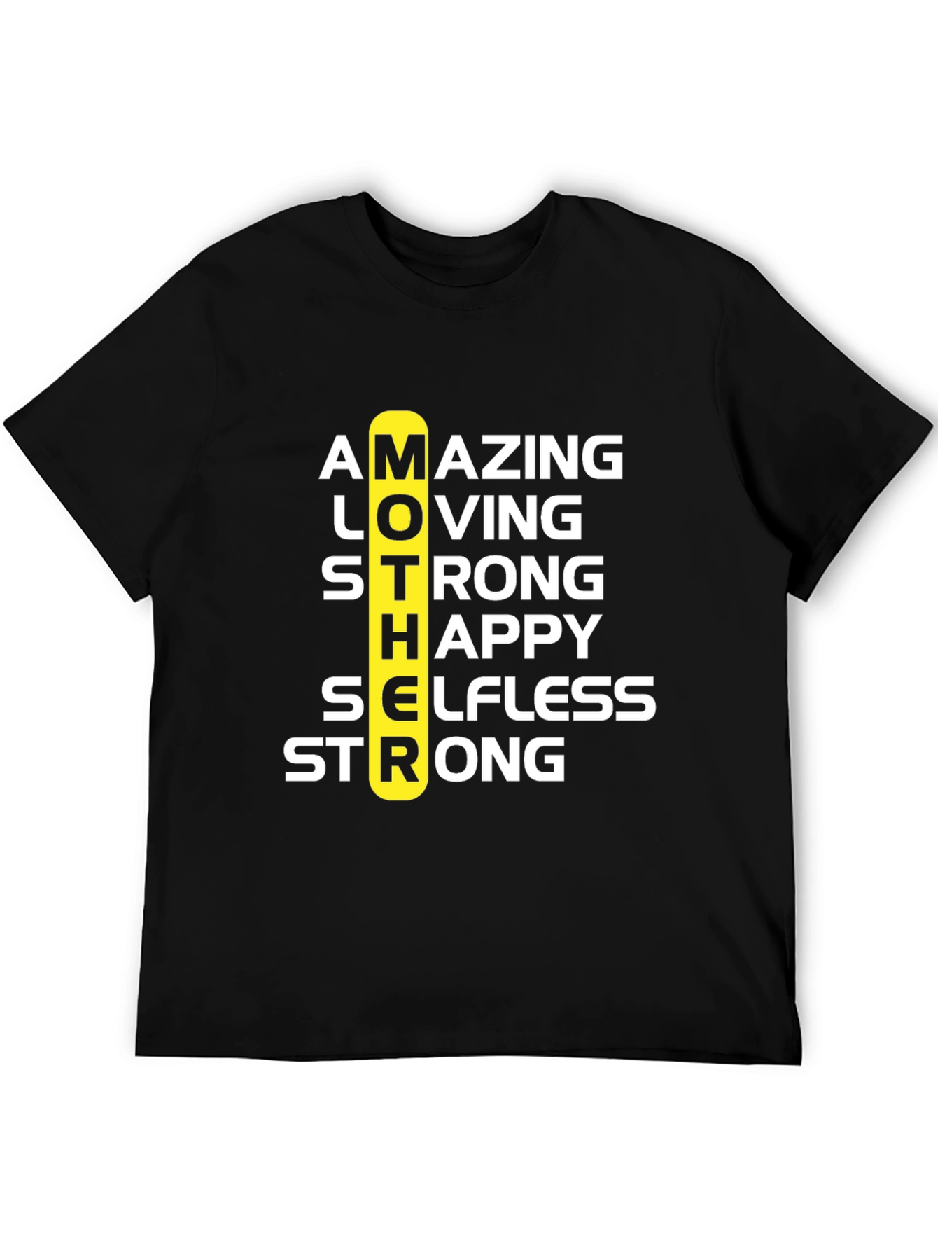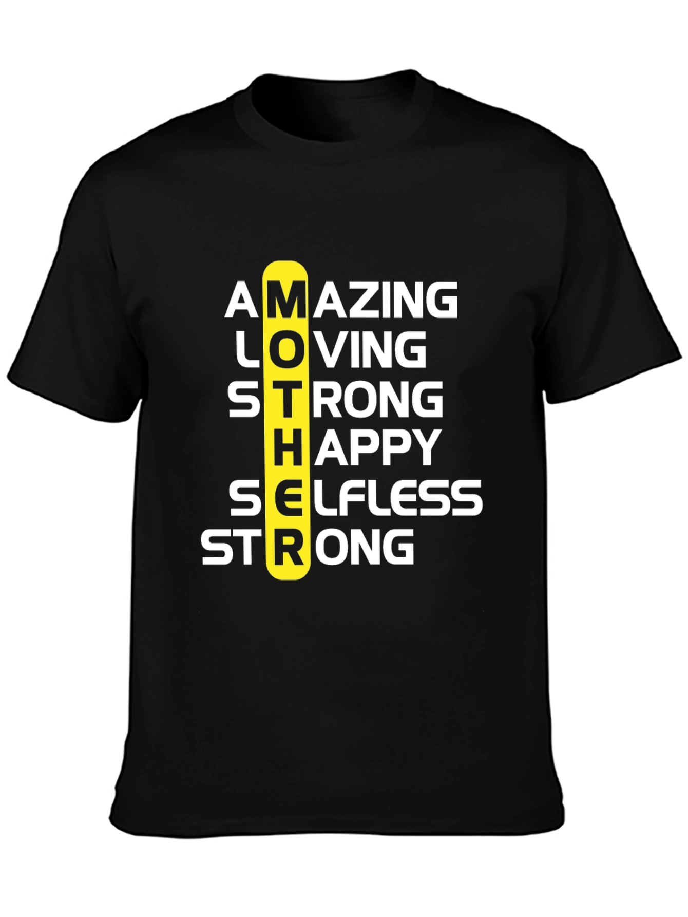 Celebra a mamá con esta camiseta negra de diseño único. Presenta la palabra 'MOTHER' en vertical, con las letras destacando las cualidades de una madre: Asombrosa, Amante, Fuerte, Feliz, Abnegada y Fuerte nuevamente. Perfecta para regalar en el Día de la Madre o cualquier ocasión especial. Fabricada con materiales suaves y cómodos para usar todo el día. Demuestra tu amor y aprecio por mamá con esta prenda significativa y elegante. Ideal para combinar con jeans o pantalones casuales.
