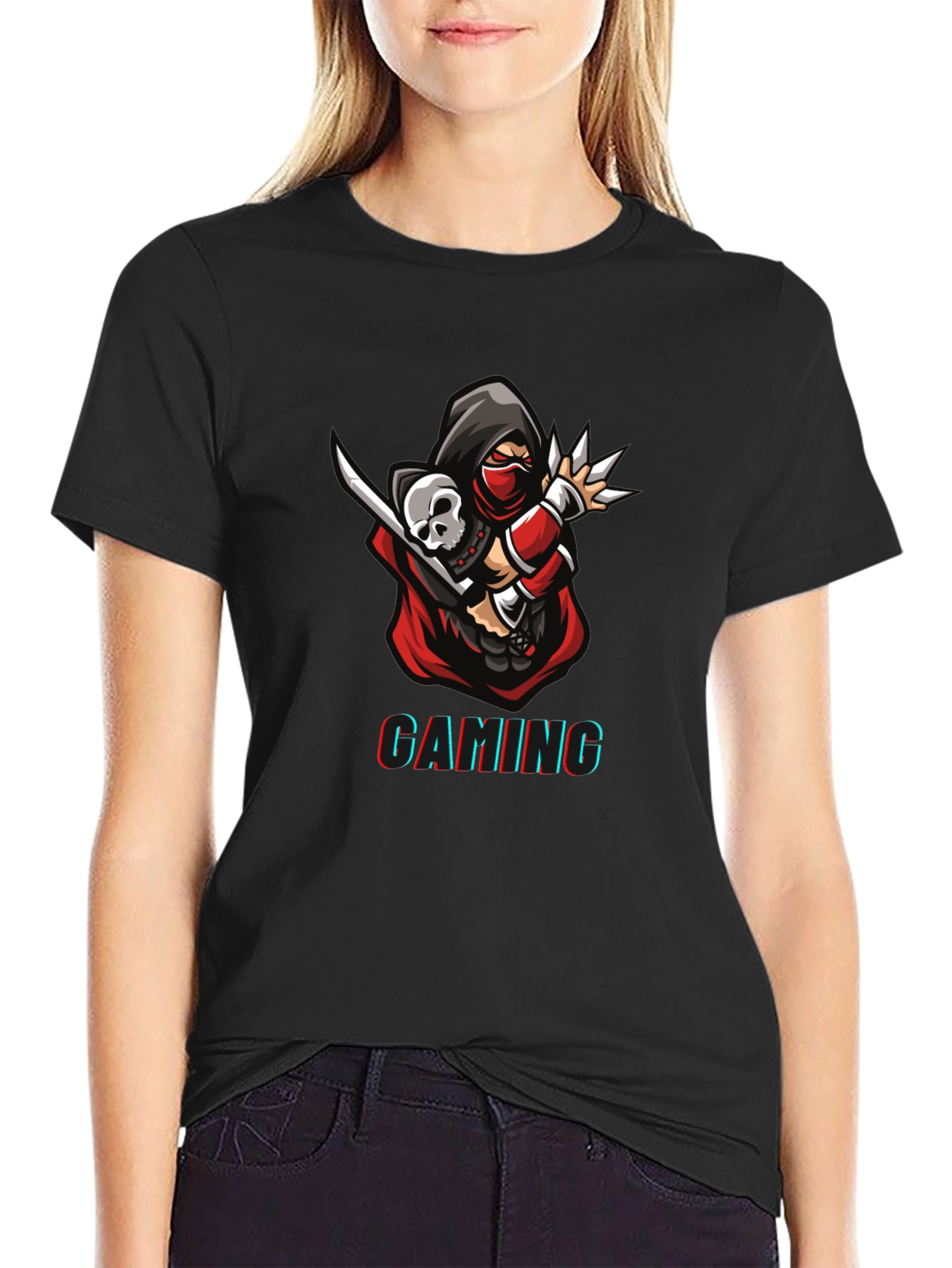 Eleva tu estilo gamer con esta camiseta negra de algodón. Presenta un llamativo diseño de un ninja con una calavera, complementado con la palabra 'GAMING' en un estilo moderno y vibrante. Ideal para mostrar tu pasión por los videojuegos con un toque único y audaz. Perfecta para usar en eventos de gaming, reuniones con amigos o simplemente para destacar en tu día a día. ¡Demuestra tu espíritu gamer con esta prenda imprescindible!