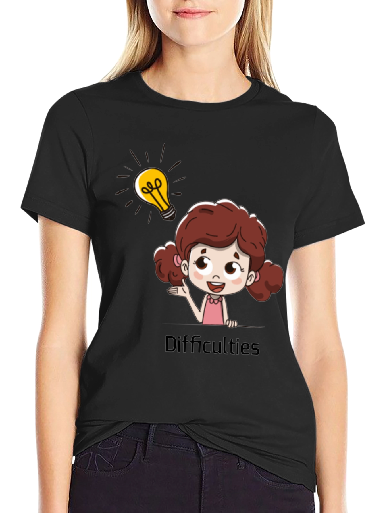 Luce esta llamativa camiseta negra de algodón con un diseño divertido y original. Presenta una ilustración de una niña sonriente bajo una bombilla encendida, simbolizando una idea brillante. La frase "Difficulties" añade un toque reflexivo. Ideal para expresar tu creatividad y optimismo con un estilo casual y moderno. Perfecta para el día a día, salidas informales o como un regalo original. Su tejido suave y cómodo asegura un ajuste perfecto. Destaca tu personalidad con esta prenda única que combina estilo y mensaje positivo.