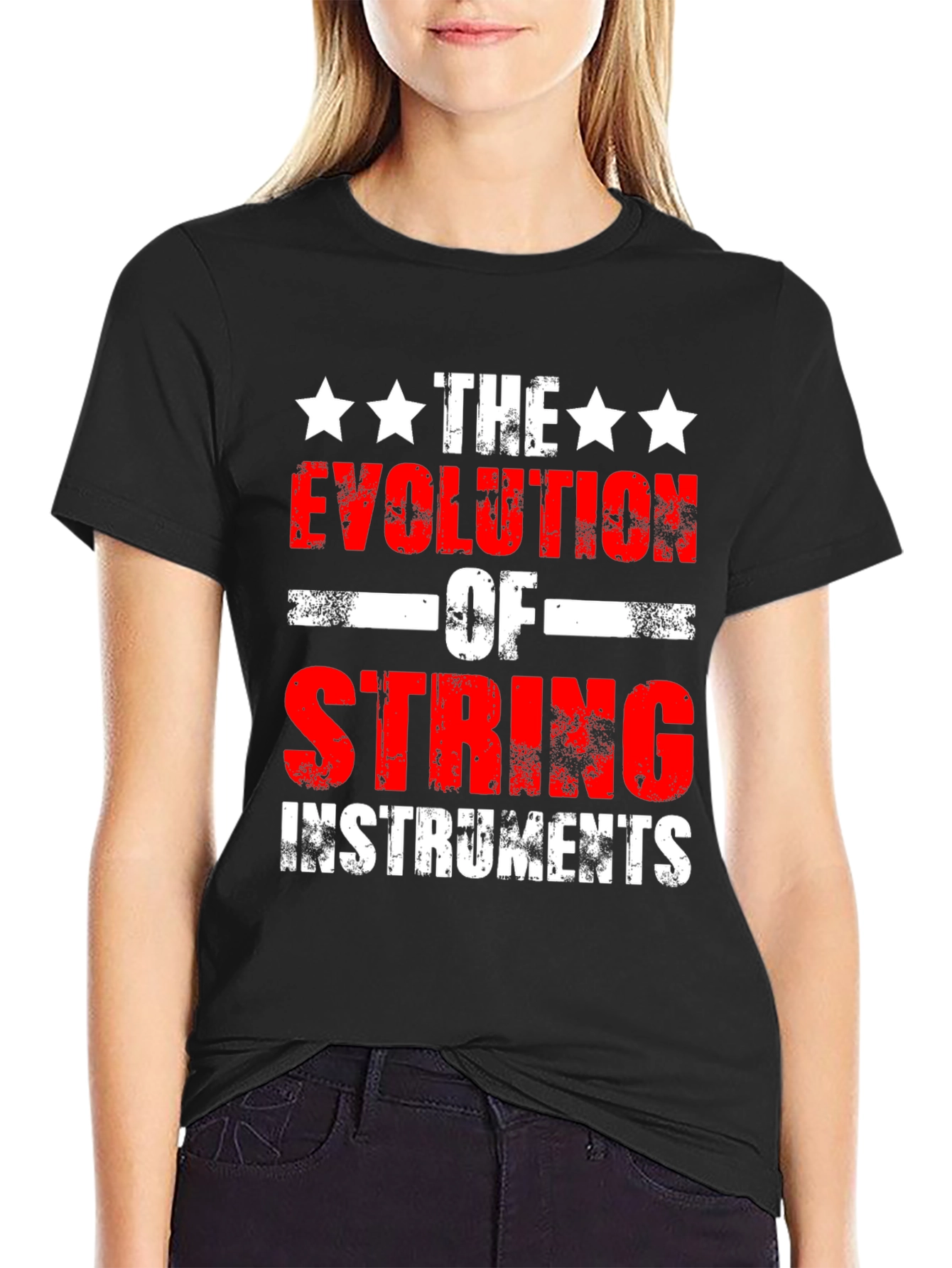 Luce tu pasión por la música con esta camiseta negra de diseño único. Presenta un llamativo estampado en blanco y rojo que proclama "La Evolución de Instrumentos de Cuerda", adornado con estrellas blancas. El diseño tiene un estilo desgastado, dándole un toque vintage y moderno a la vez. Ideal para músicos, amantes de la música y aquellos que aprecian un estilo original. Perfecta para usar en conciertos, ensayos, o simplemente para expresar tu amor por la música en tu día a día. Fabricada en un material cómodo y duradero, esta camiseta se convertirá en tu prenda favorita para cualquier ocasión informal.