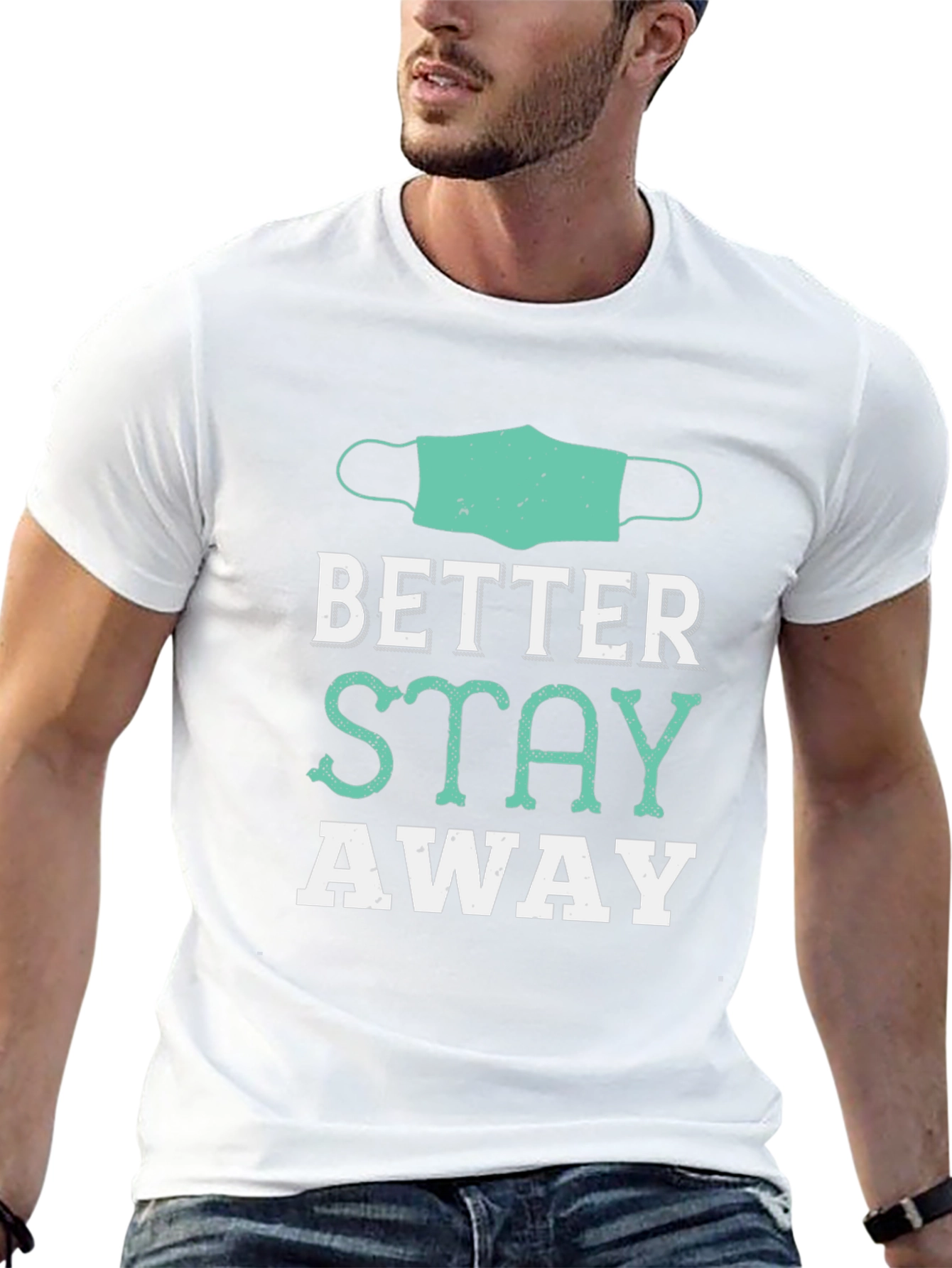 Esta camiseta negra presenta un diseño llamativo con un mensaje de distanciamiento social. En la parte superior, destaca una ilustración de una mascarilla facial en un tono verde azulado, seguida de las palabras "BETTER STAY AWAY" en letras blancas y verde azulado con un estilo que recuerda a la tipografía retro. La camiseta parece estar hecha de algodón suave, lo que promete comodidad durante todo el día. Perfecta para aquellos que desean expresar su postura sobre el espacio personal con humor y estilo. Ideal para usar en salidas casuales, eventos sociales o simplemente para relajarse en casa con un toque de sarcasmo.