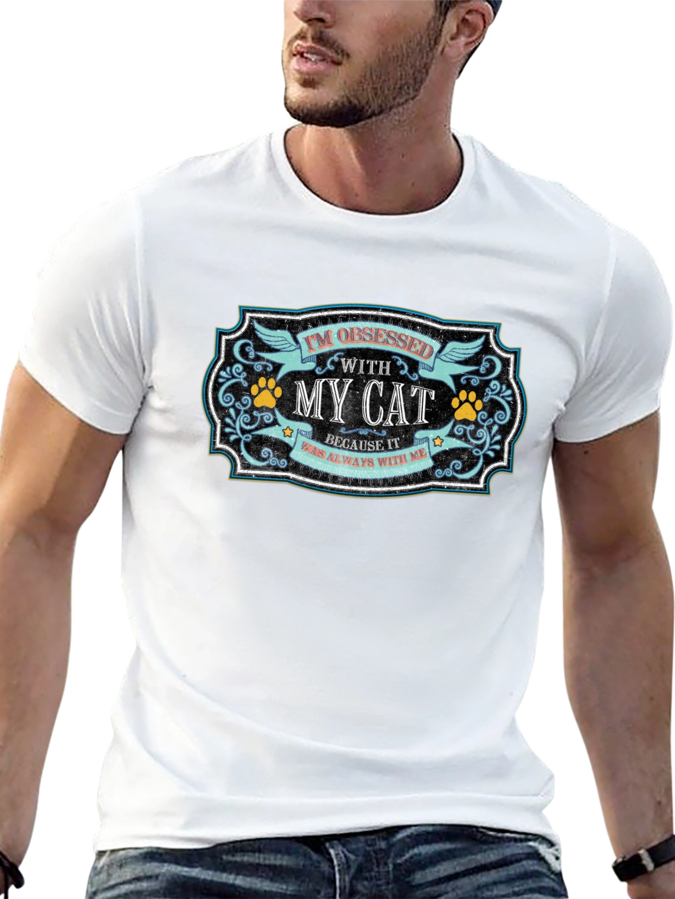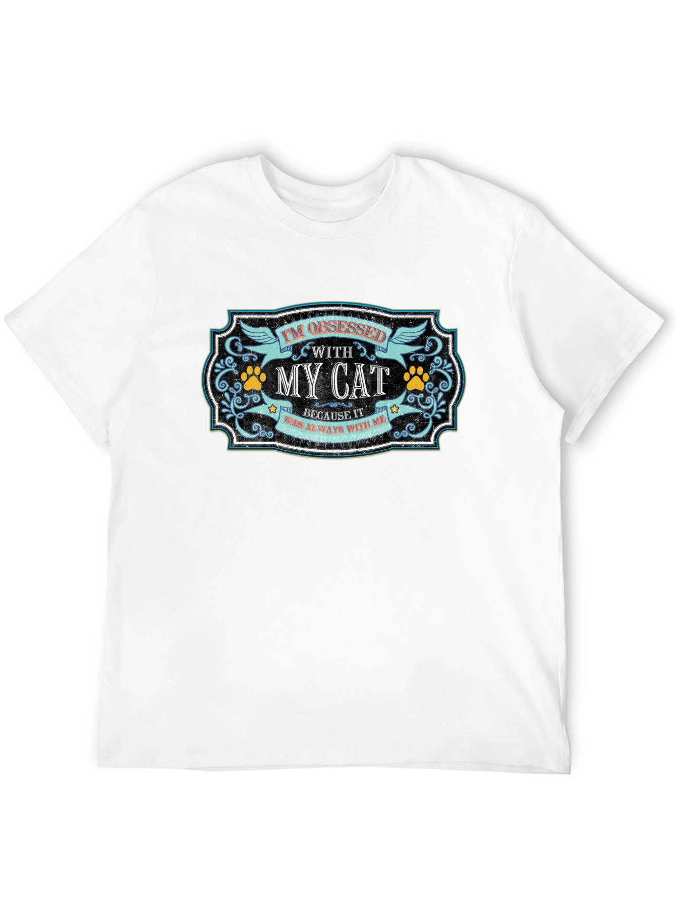 Esta camiseta negra de manga corta presenta un diseño llamativo y divertido. En el centro, un gráfico decorativo declara "Estoy obsesionado con mi gato porque siempre estuvo conmigo", adornado con huellas de patas y elementos vintage. Ideal para amantes de los gatos que desean expresar su cariño de manera casual y con estilo. Perfecta para uso diario, salidas informales o como un regalo especial para un dueño de gato. ¡Muestra tu amor por tu felino con esta prenda única y cómoda!