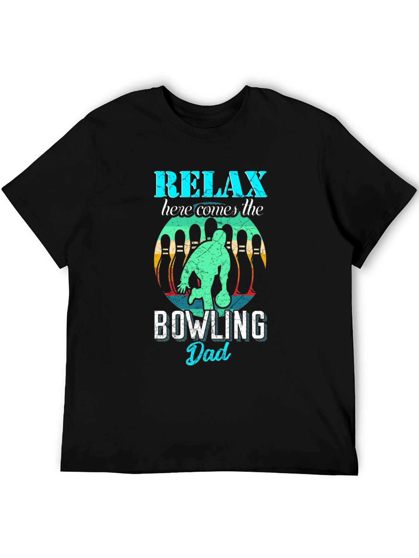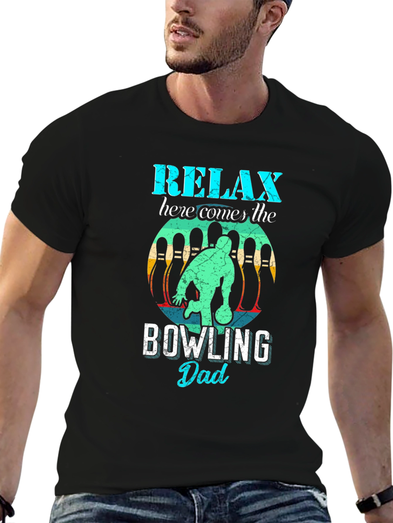 Esta camiseta negra presenta un diseño llamativo con la frase "RELAX here comes the Bowling Dad". La imagen central muestra una silueta de un jugador de bolos en acción, rodeado de bolos estilizados. El diseño incorpora un efecto retro con colores vibrantes y desgastados. Ideal para los amantes del bowling y los padres orgullosos, esta camiseta es perfecta para usar en la bolera, eventos deportivos o simplemente para el día a día. Con su estilo único y mensaje divertido, seguramente llamará la atención y demostrará tu pasión por el bowling.
