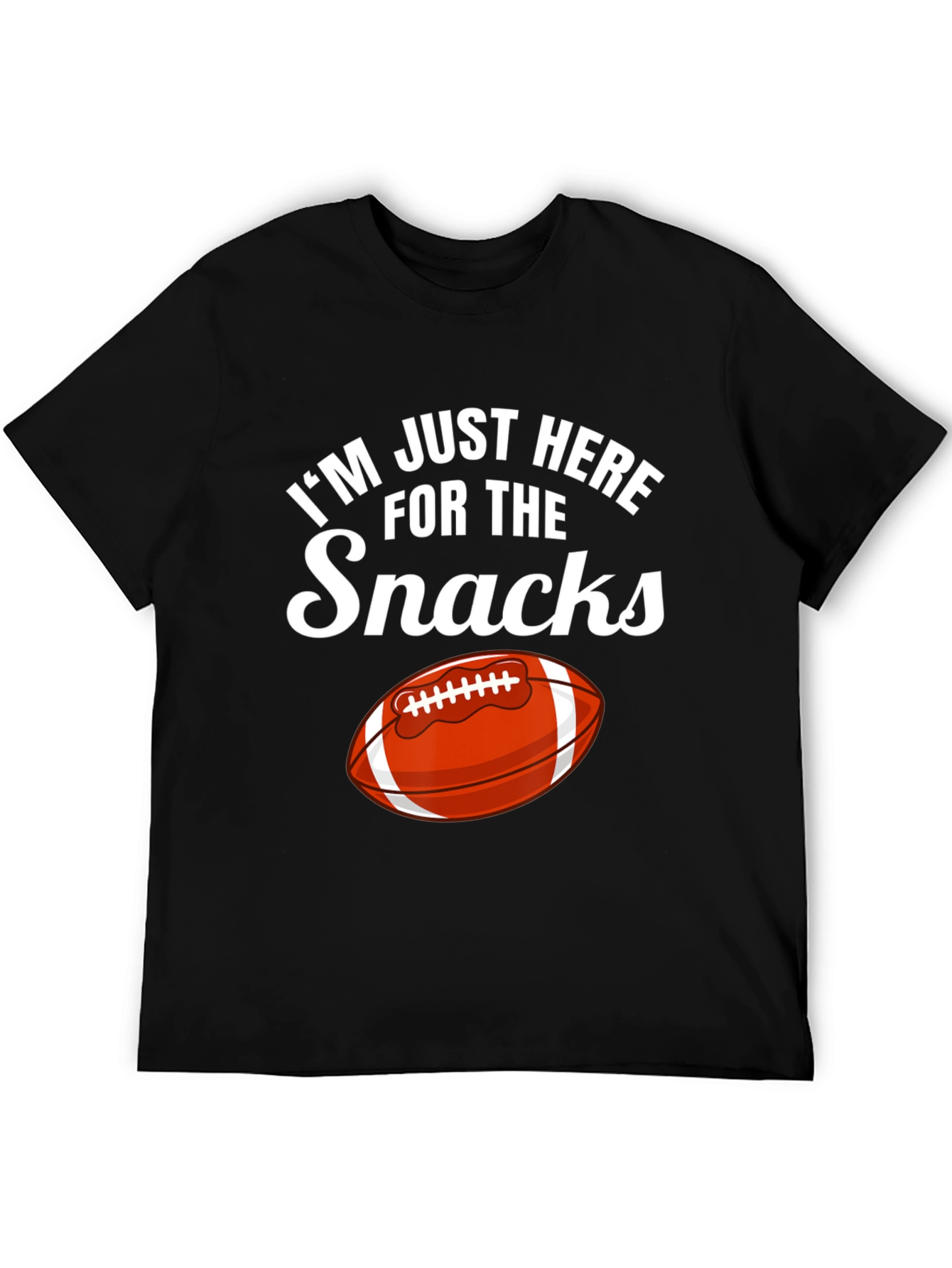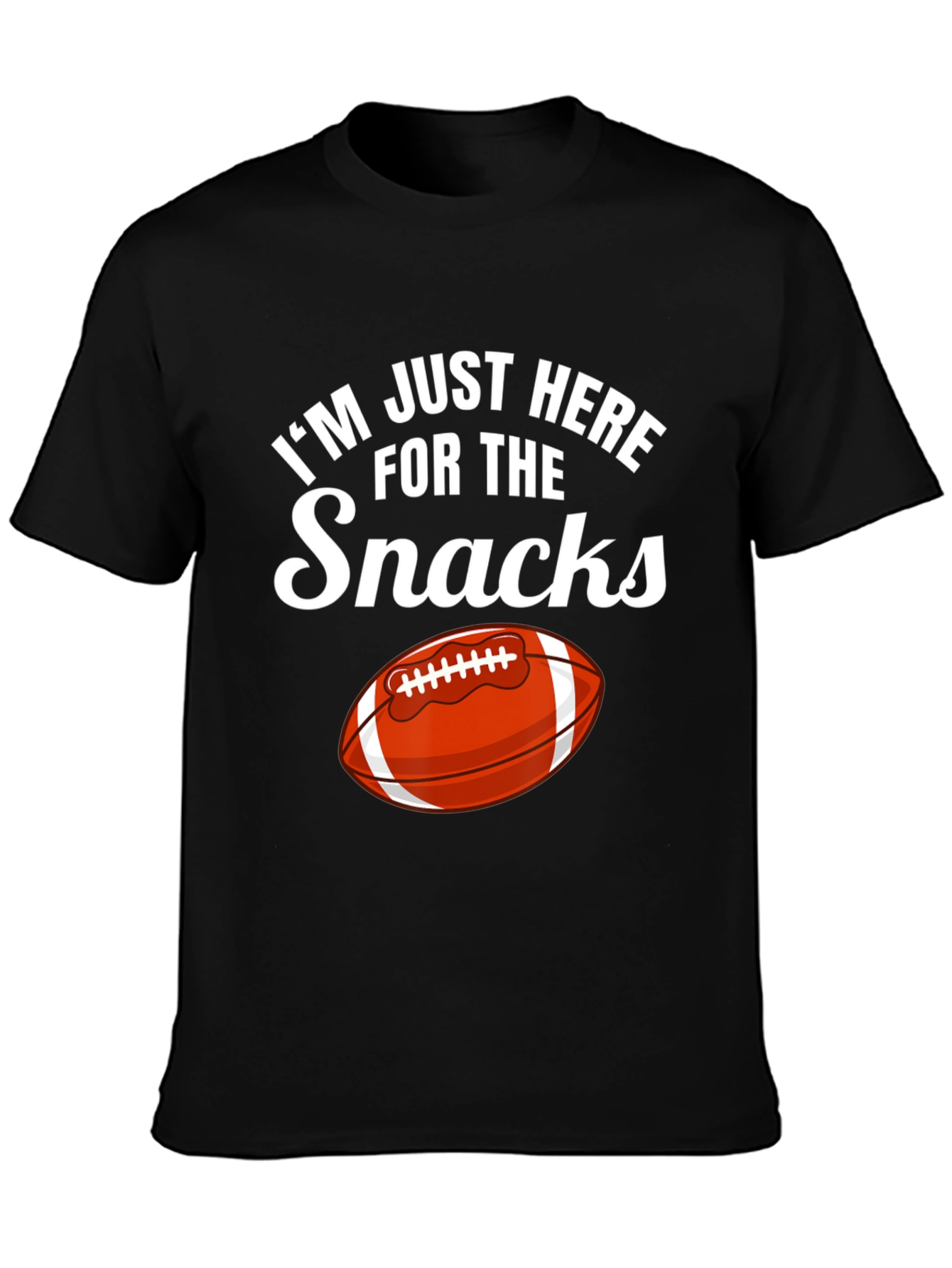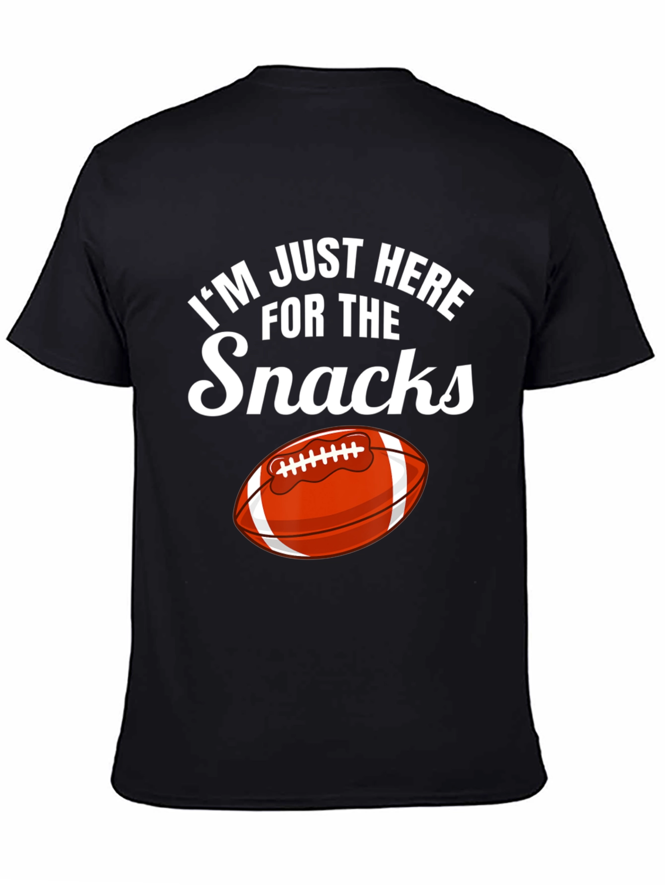 ¡Prepárate para el gran juego con esta divertida camiseta! De color negro clásico, esta camiseta presenta un diseño llamativo con la frase "I'm Just Here for the Snacks" (Solo estoy aquí por la comida) en letras blancas y una ilustración de un balón de fútbol americano. Perfecta para los aficionados al fútbol que aman los aperitivos tanto como el juego. Confeccionada en un material suave y cómodo, esta camiseta es ideal para usar durante los partidos, barbacoas o simplemente para mostrar tu espíritu deportivo con un toque de humor. Una opción ideal para regalar a cualquier amante del fútbol.