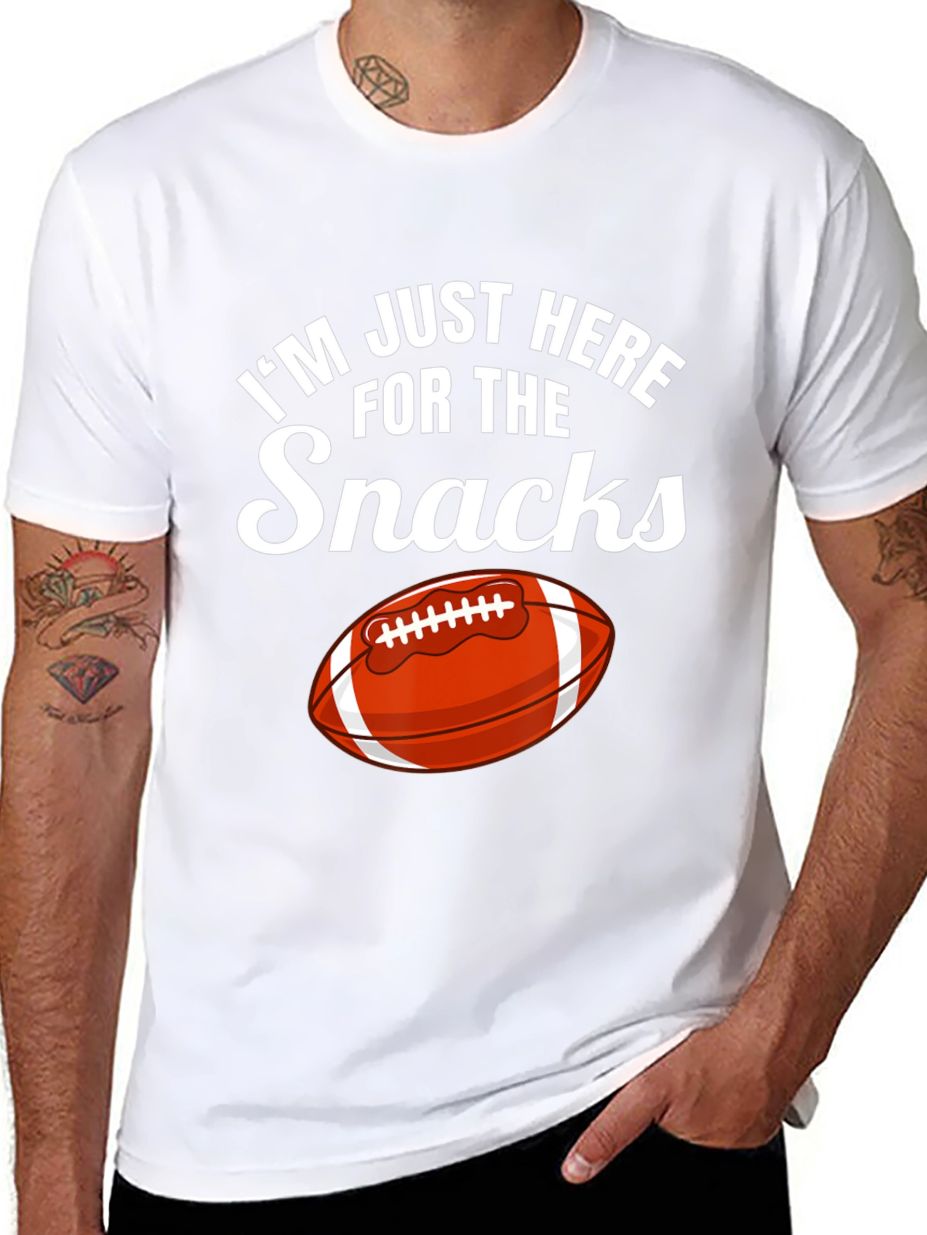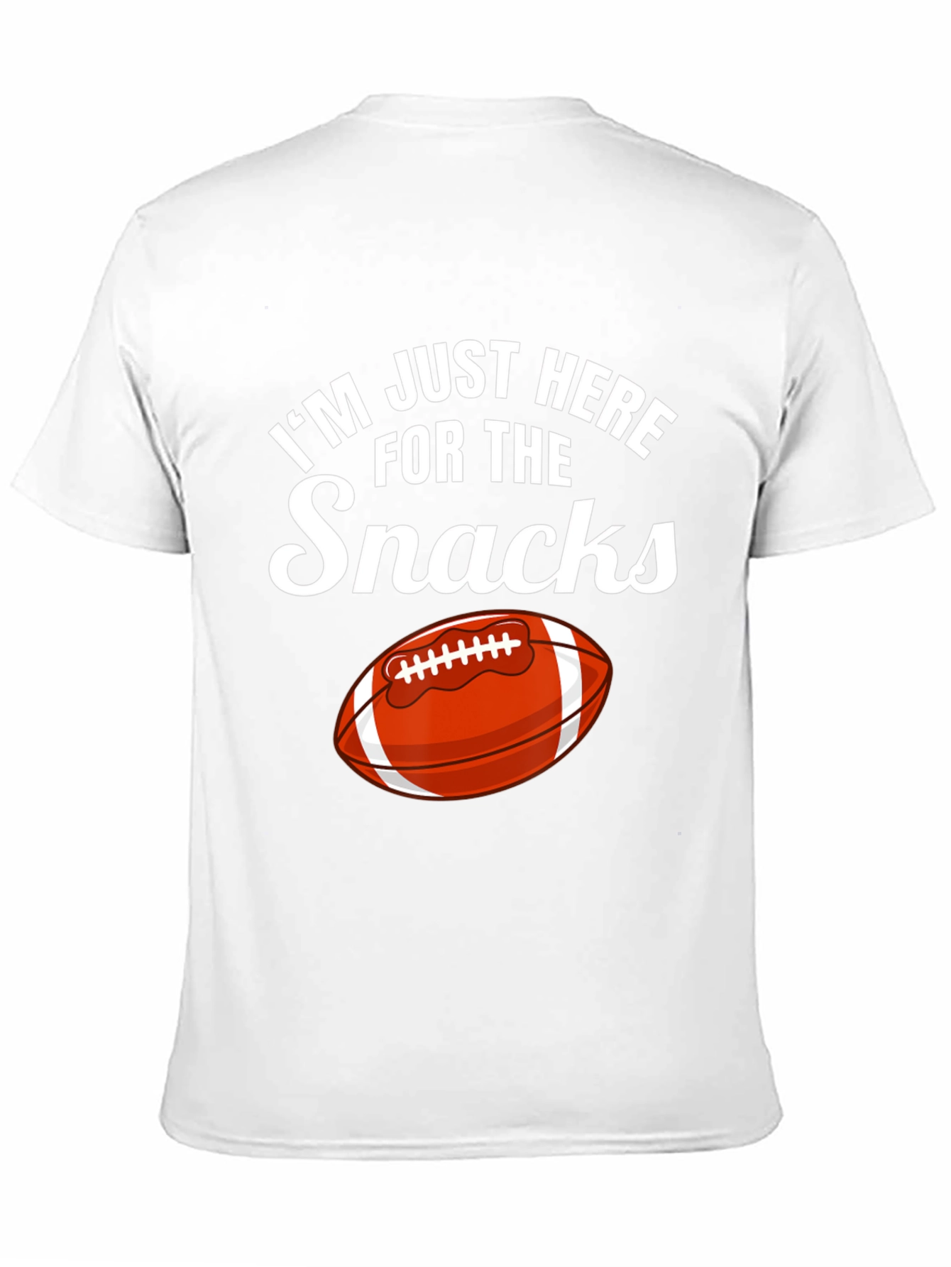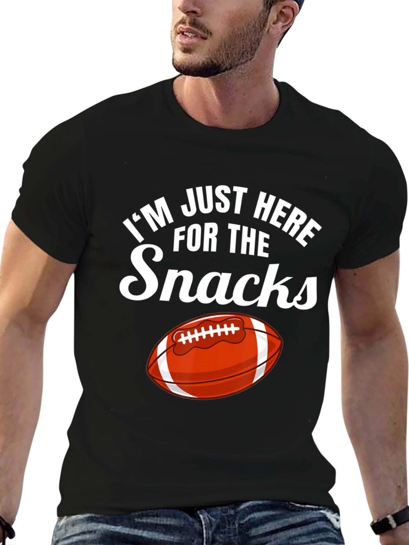 ¡Prepárate para el gran juego con esta divertida camiseta! De color negro clásico, esta camiseta presenta un diseño llamativo con la frase "I'm Just Here for the Snacks" (Solo estoy aquí por la comida) en letras blancas y una ilustración de un balón de fútbol americano. Perfecta para los aficionados al fútbol que aman los aperitivos tanto como el juego. Confeccionada en un material suave y cómodo, esta camiseta es ideal para usar durante los partidos, barbacoas o simplemente para mostrar tu espíritu deportivo con un toque de humor. Una opción ideal para regalar a cualquier amante del fútbol.