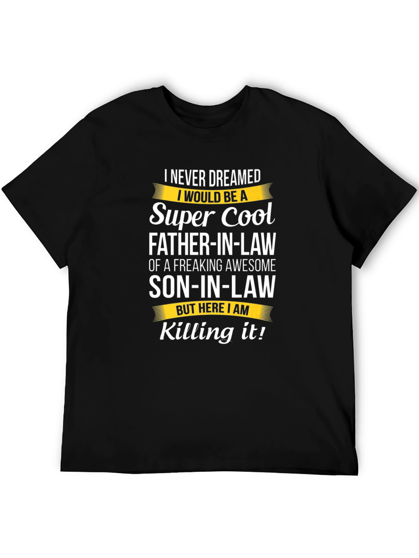 ¡Demuestra tu orgullo como suegro genial con esta camiseta única! Con un diseño llamativo, esta camiseta negra destaca la frase "I NEVER DREAMED I WOULD BE A Super Cool FATHER-IN-LAW OF A FREAKING AWESOME SON-IN-LAW BUT HERE I AM Killing it!" en letras blancas y amarillas contrastantes. Perfecta para regalar a un suegro increíble o para lucir en reuniones familiares. Fabricada con materiales cómodos y duraderos, esta camiseta es ideal para el uso diario. ¡Consigue la tuya y presume de tener al mejor yerno del mundo!