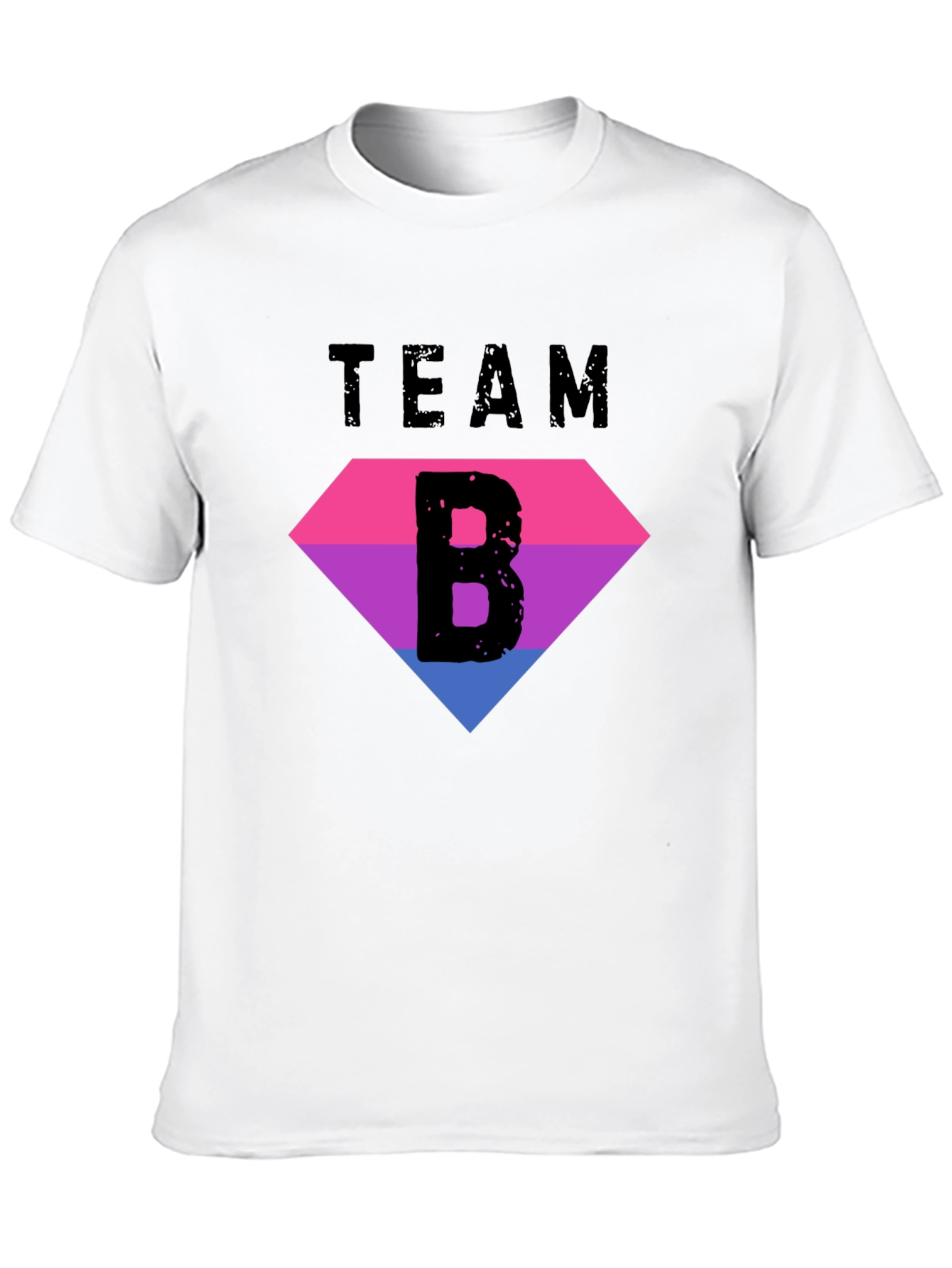 Muestra tu orgullo con esta camiseta negra de manga corta con un diseño llamativo. Presenta la palabra "TEAM" en la parte superior, debajo de la cual hay un diamante con los colores de la bandera bisexual (rosa, morado y azul). En el centro del diamante, destaca una gran letra "B" negra con un efecto desgastado, dándole un toque urbano y moderno. Perfecta para llevar en eventos del orgullo, manifestaciones o simplemente para expresar tu identidad con estilo. Fabricada con materiales cómodos y duraderos, esta camiseta es ideal para el uso diario. ¡Únete al Team B y celebra la diversidad!