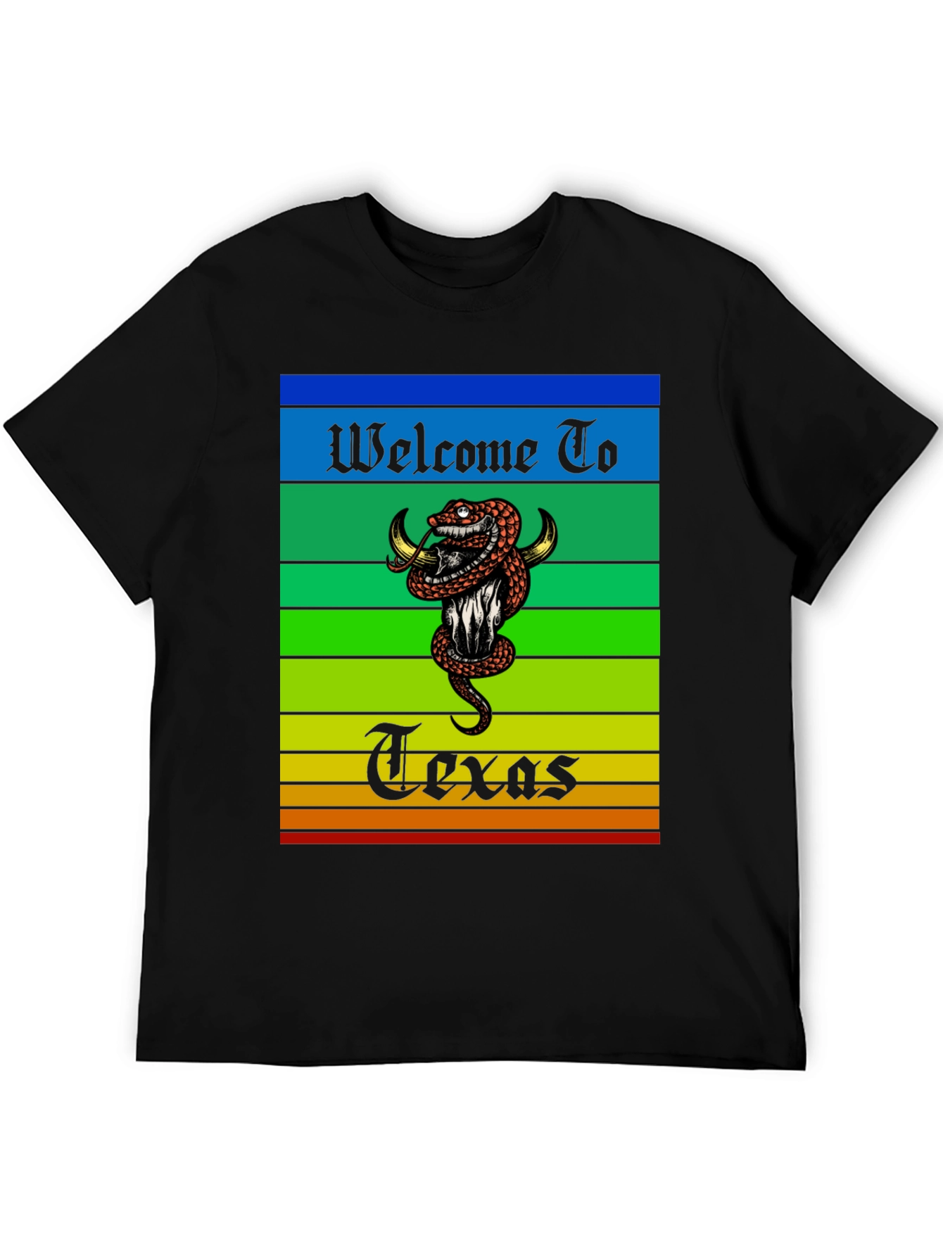 Muestra tu amor por Texas con esta llamativa camiseta negra. Presenta un diseño vibrante con la leyenda "Welcome To Texas" sobre un fondo de arcoíris. En el centro, una serpiente enroscada con cuernos añade un toque audaz y único. Fabricada con materiales cómodos y duraderos, esta camiseta es perfecta para el uso diario, eventos especiales o como un regalo original. Su diseño llamativo asegura que te destacarás entre la multitud. Ideal para aquellos que aprecian la moda con un toque tejano.