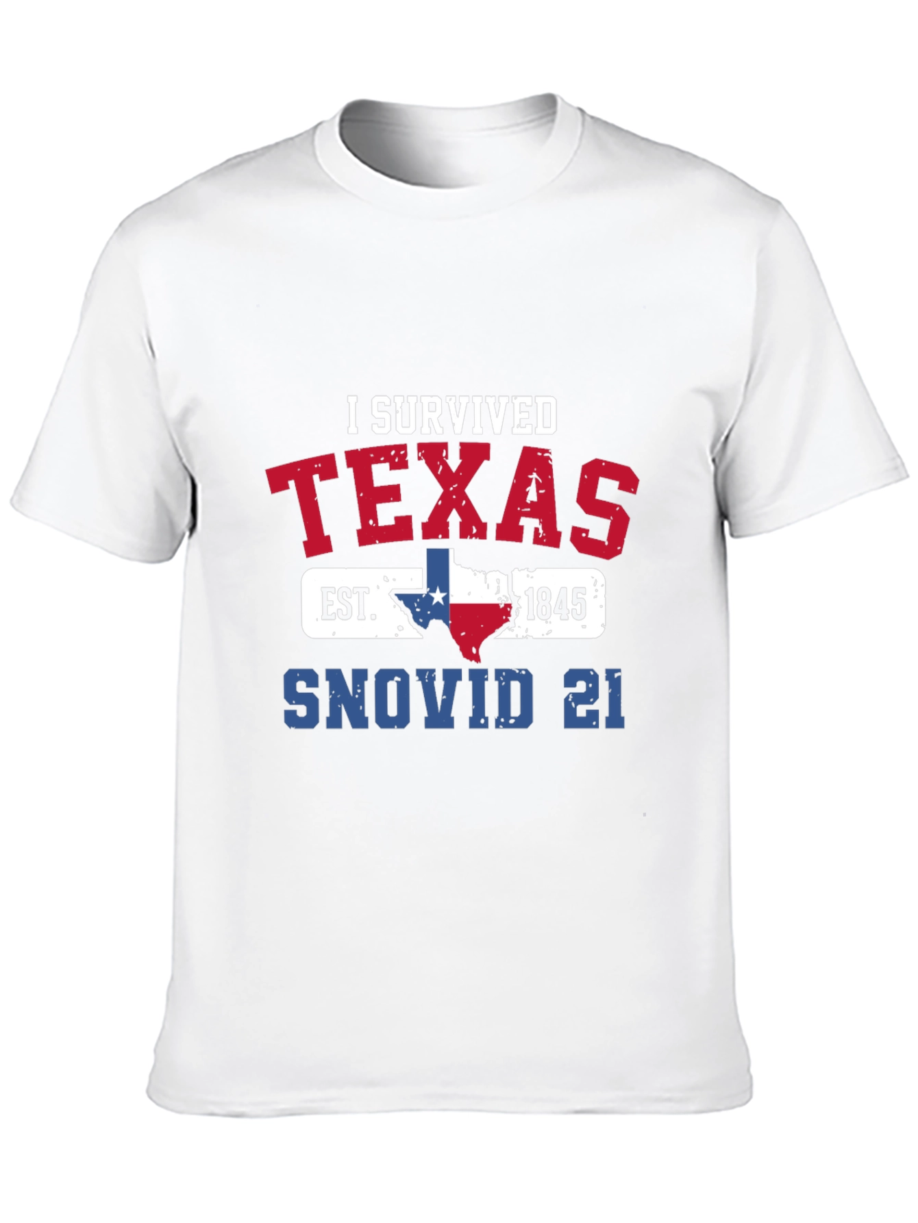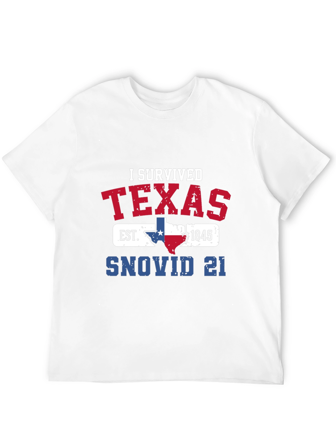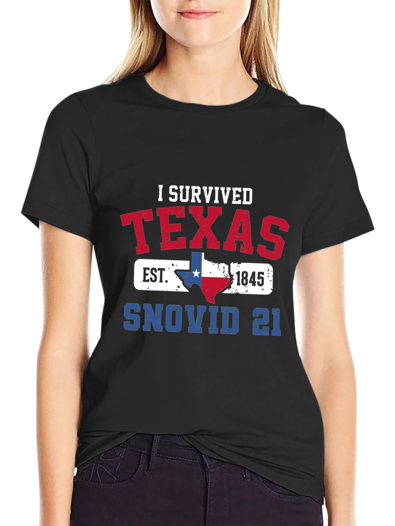 Luce con orgullo esta camiseta negra de diseño único que celebra la resistencia. La camiseta presenta un estampado llamativo con la leyenda "I Survived Texas" en letras rojas y "SNOVID 21" en azul, recordando un evento memorable. Incorpora el diseño de la bandera de Texas y el año de establecimiento "EST. 1845". Hecha de un material suave y cómodo, esta camiseta de manga corta es ideal para uso diario, eventos informales o como un regalo original para aquellos que aman Texas. Muestra tu espíritu de supervivencia con estilo y comodidad. ¡Adquiérela ya!